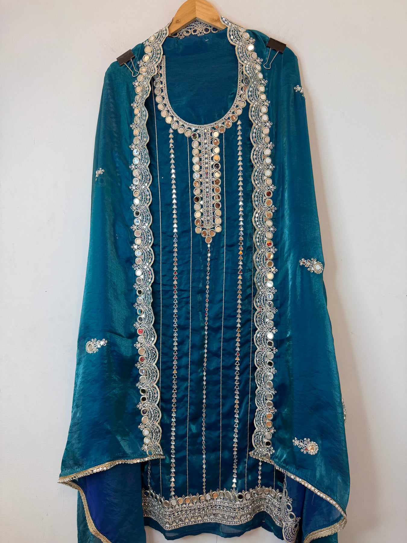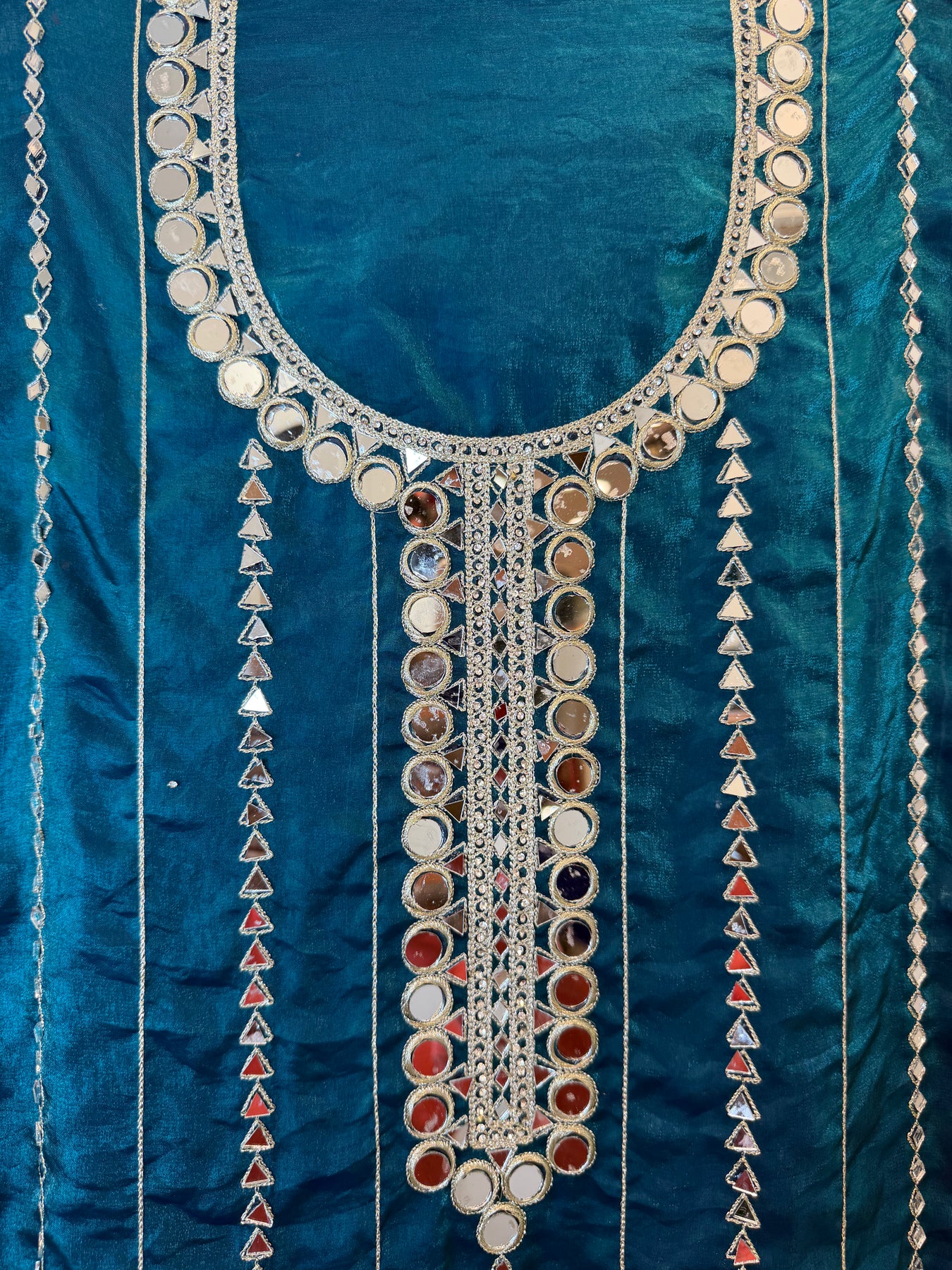 • Shirt: Glass organza shirt with real mirror work, intricate aari embroidery, and stone highlights