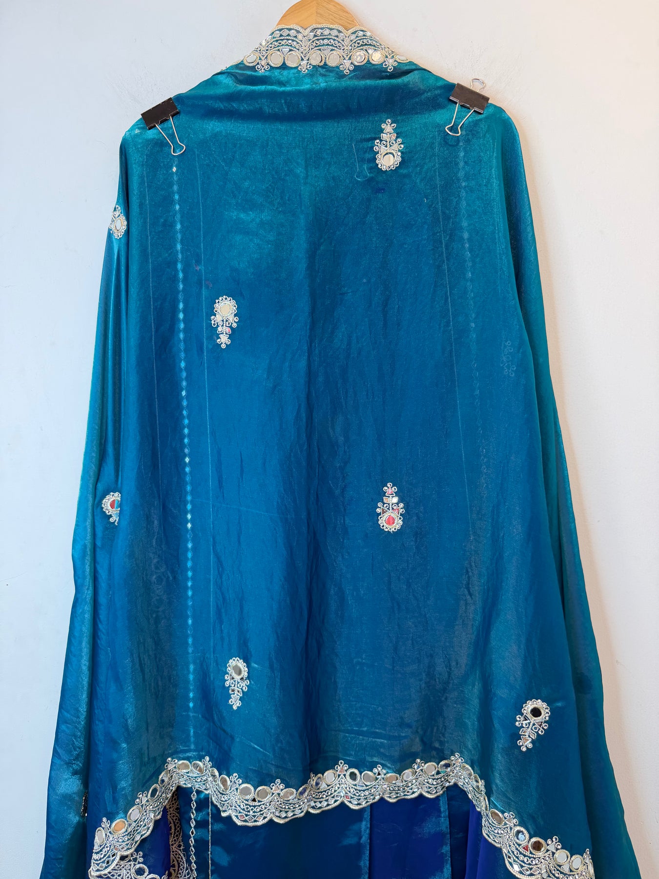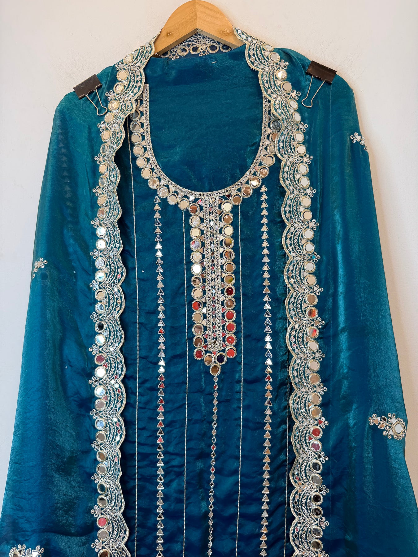 • Dupatta: Glass organza dupatta featuring matching mirror & aari work with elegant cutwork detailing