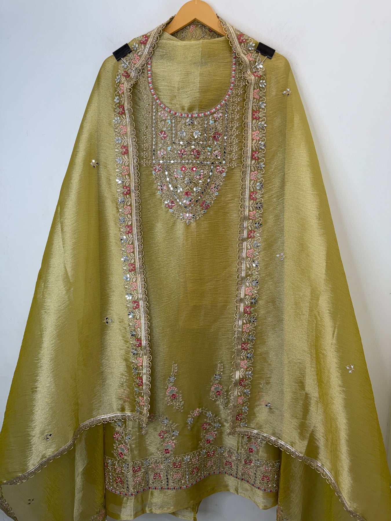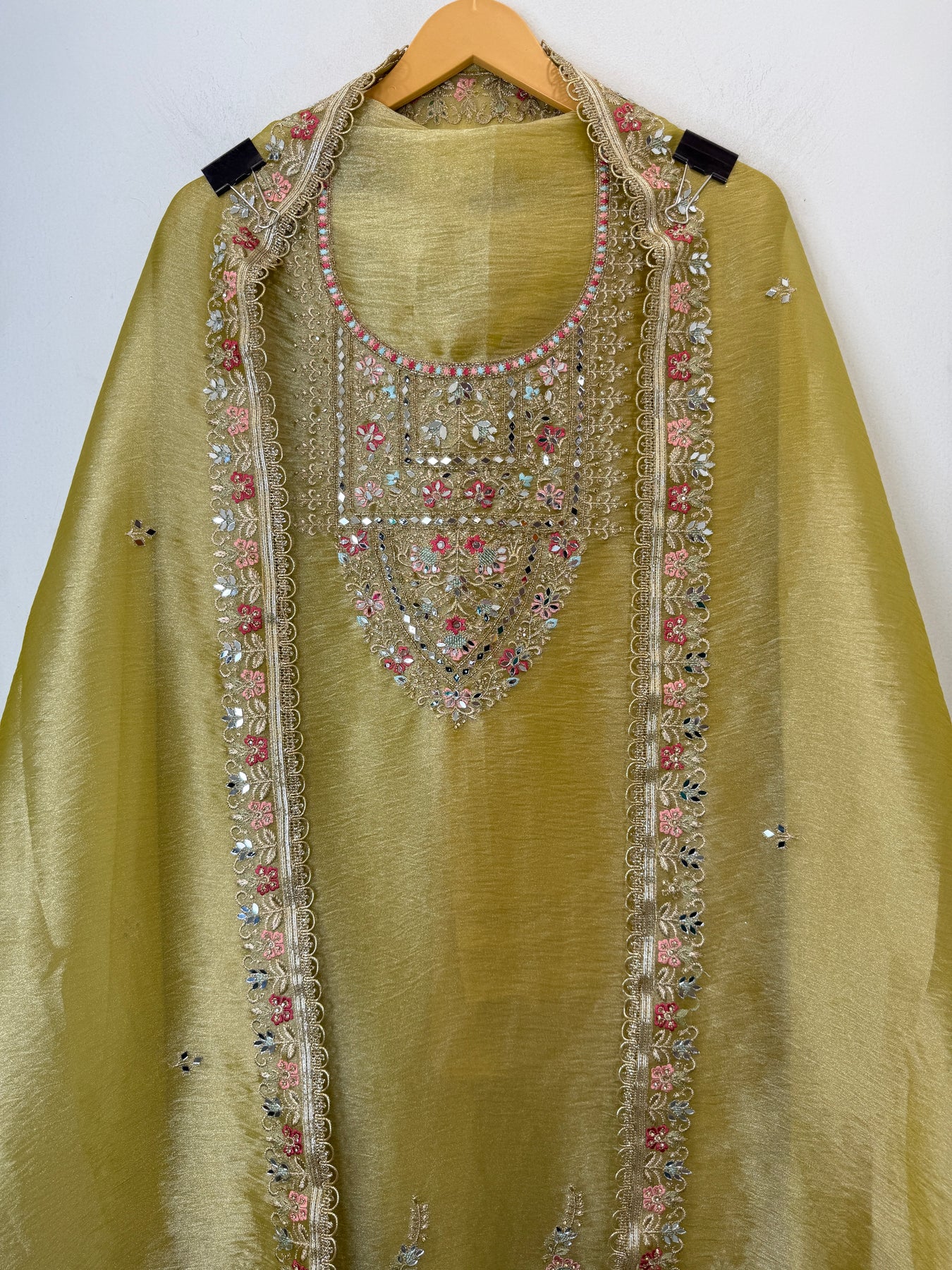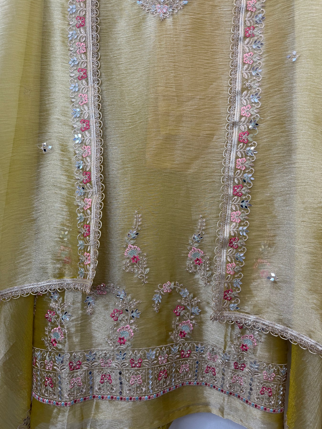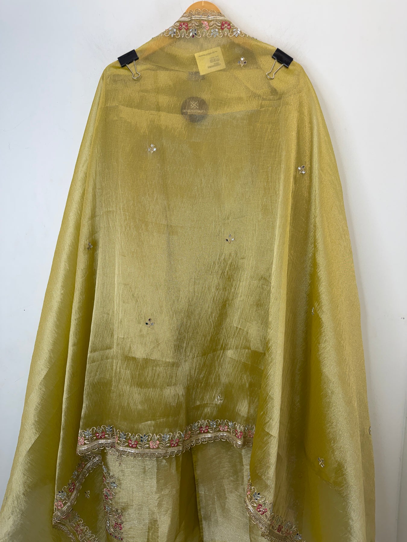 • Dupatta: Tissue dupatta adorned with zari and embroidery work, mirror highlights, and gota lace finishing on the borders