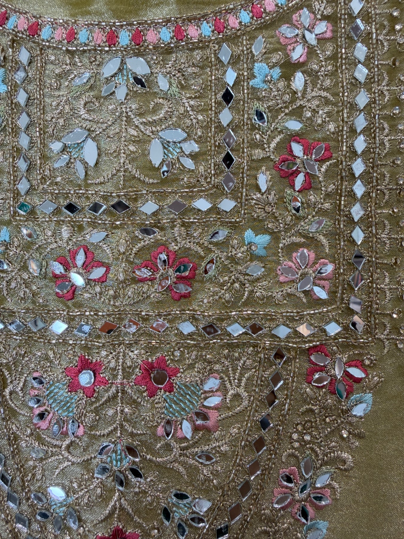 • Shirt: Tissue shirt with zari work on the neckline, highlighted with mirror and cutdana detailing; ghera embroidered with zari and thread work, finished with mirror and cutdana highlights