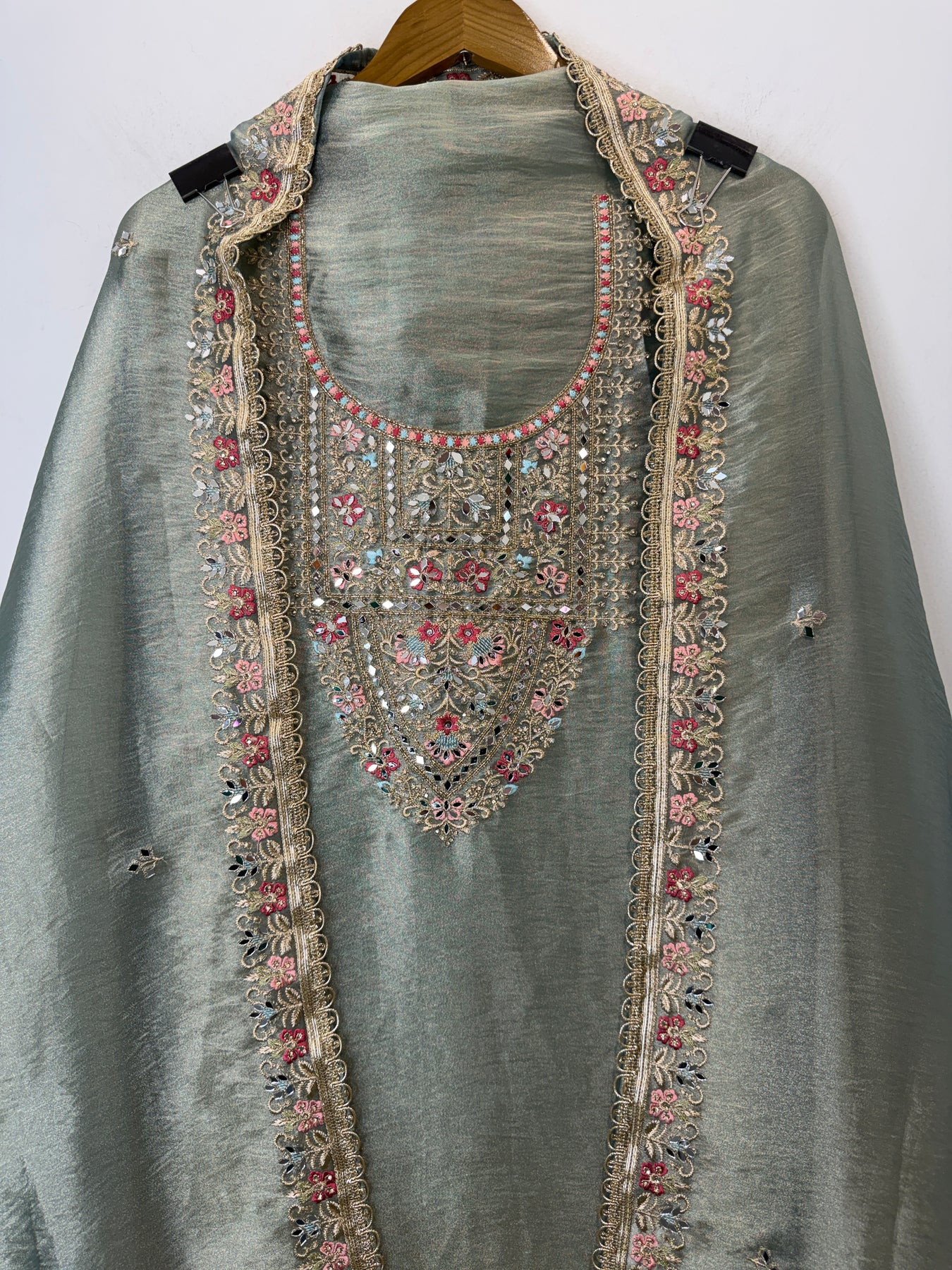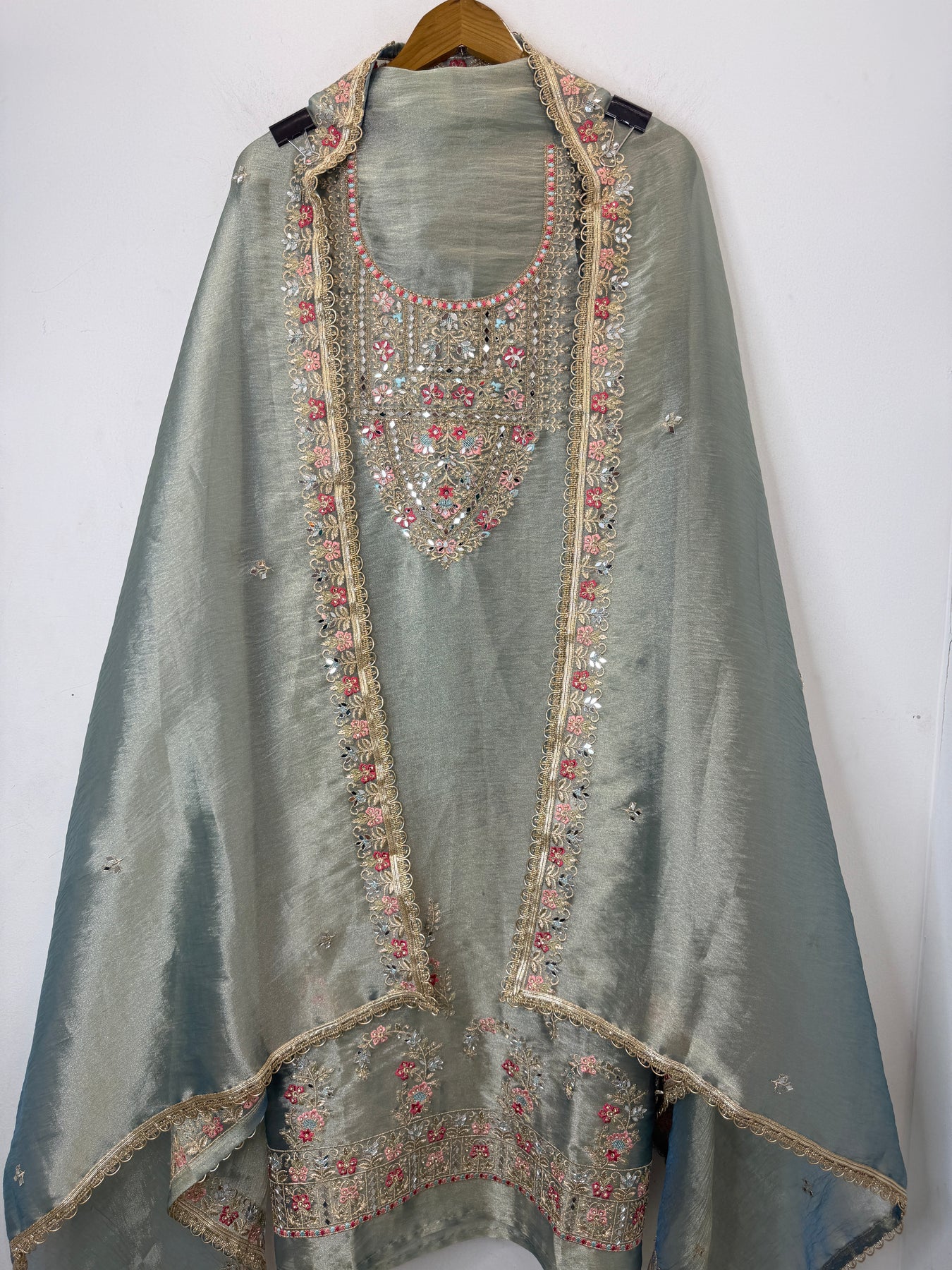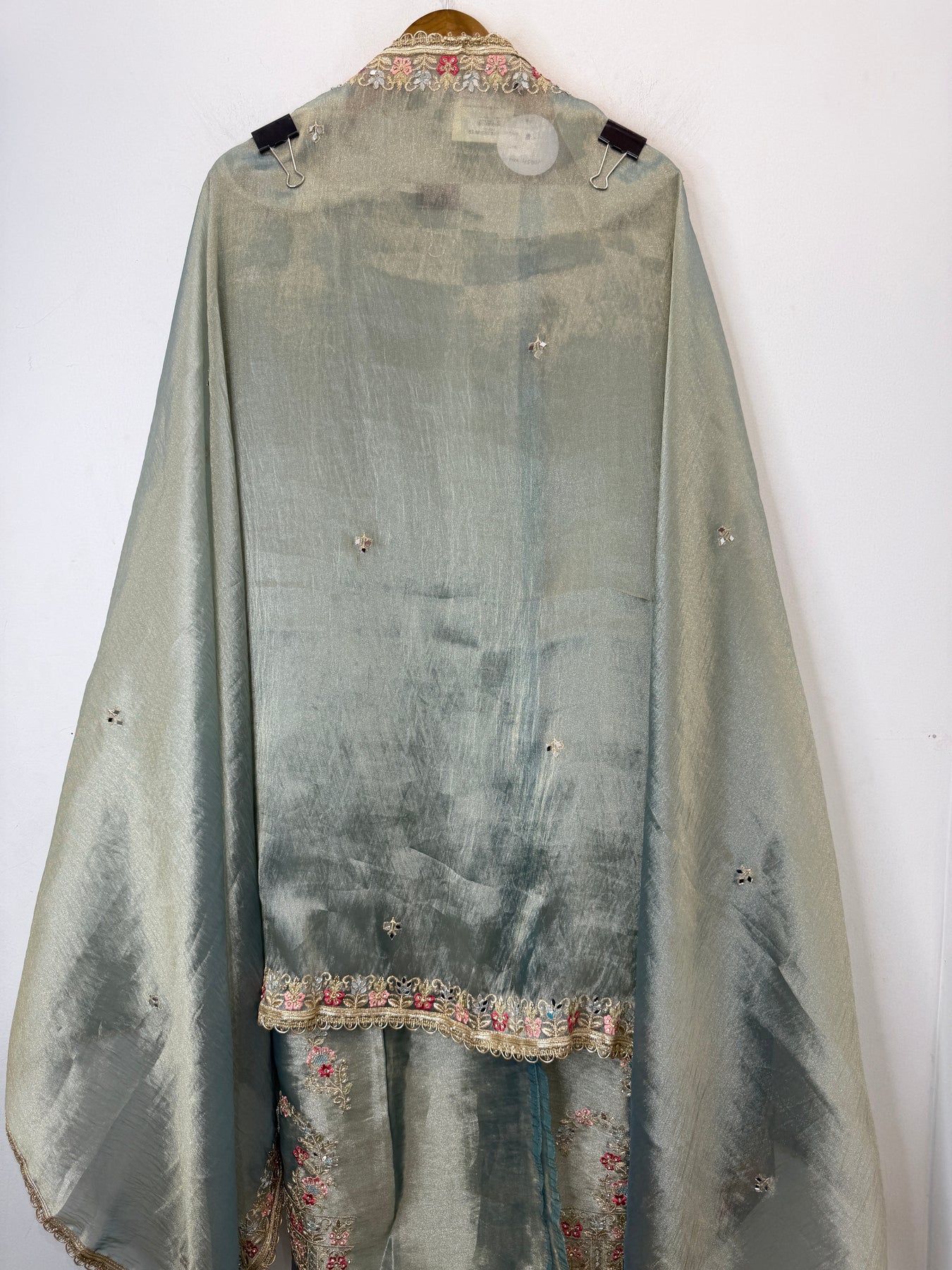 Dupatta: Tissue dupatta adorned with zari and embroidery work, mirror highlights, and gota lace finishing on the borders