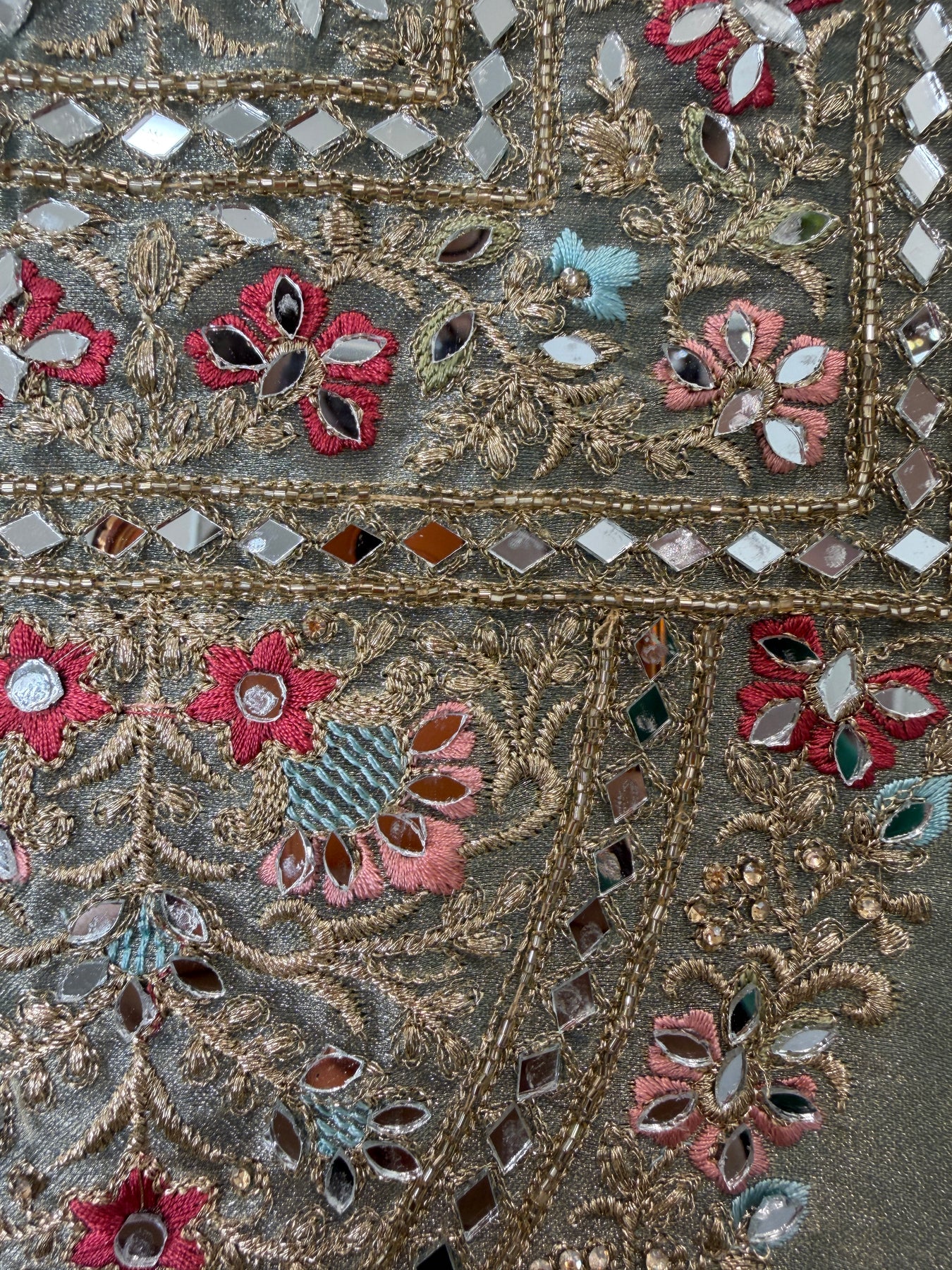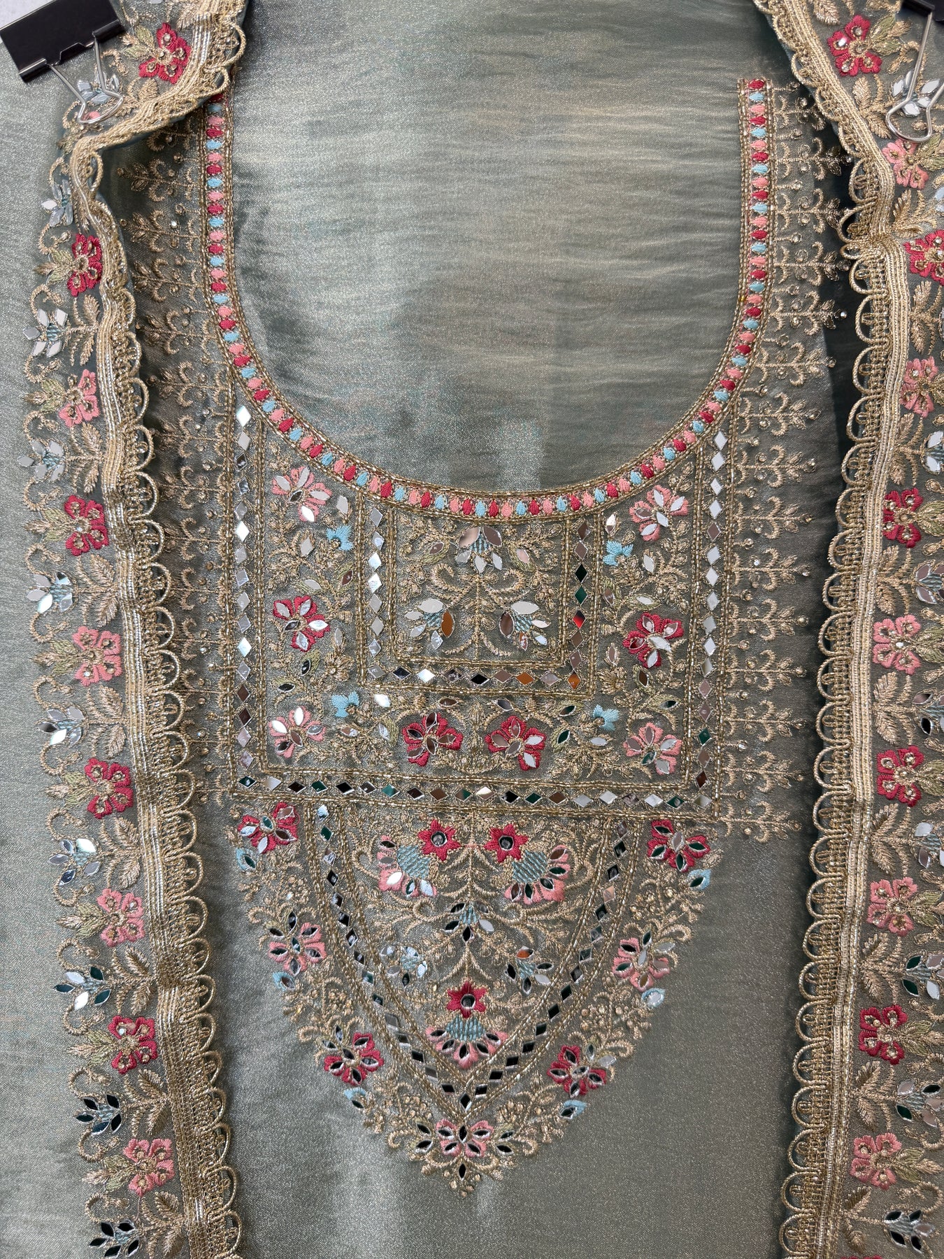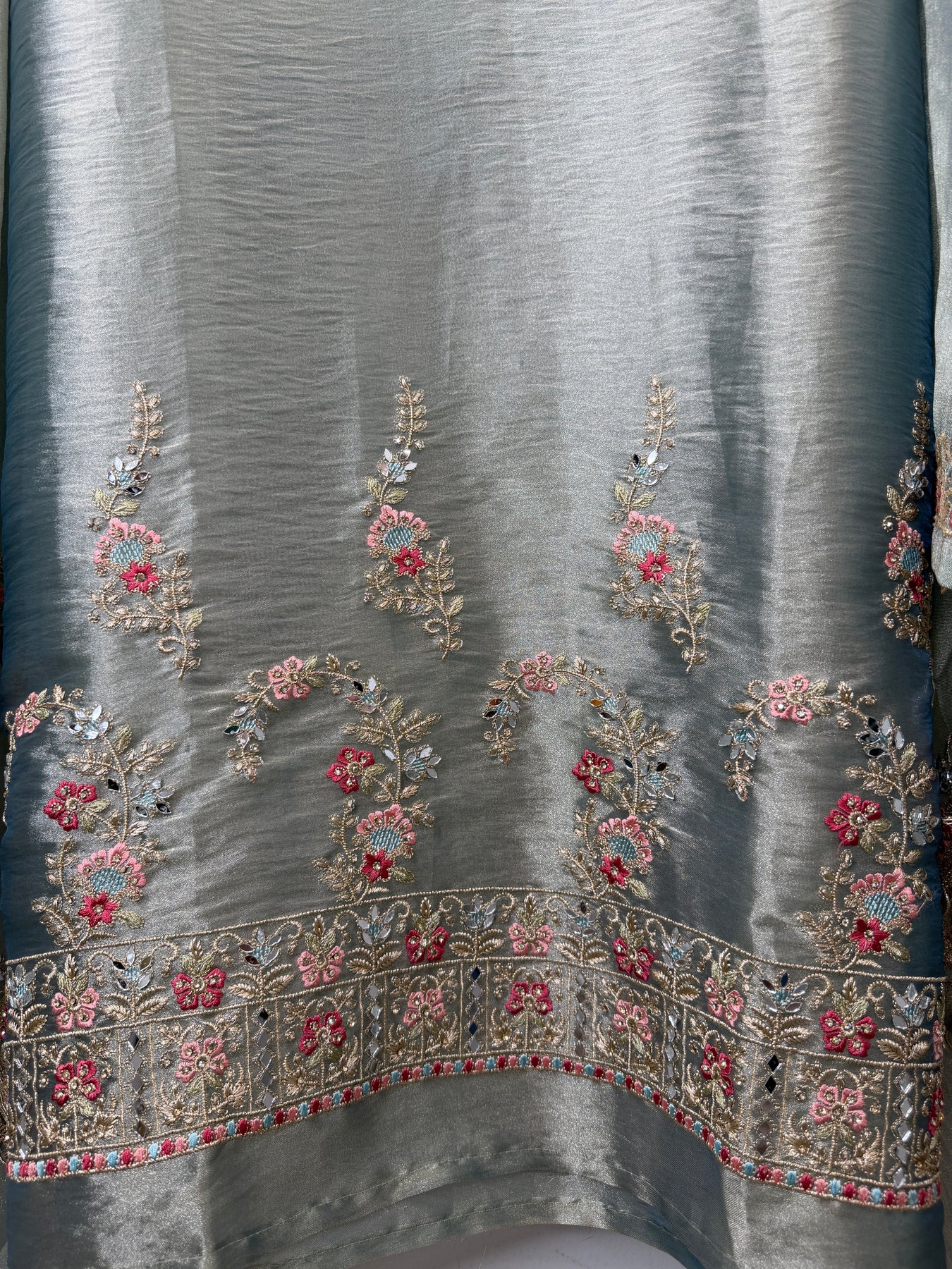 Shirt: Tissue shirt with zari work on the neckline, highlighted with mirror and cutdana detailing; ghera embroidered with zari and thread work, finished with mirror and cutdana highlights