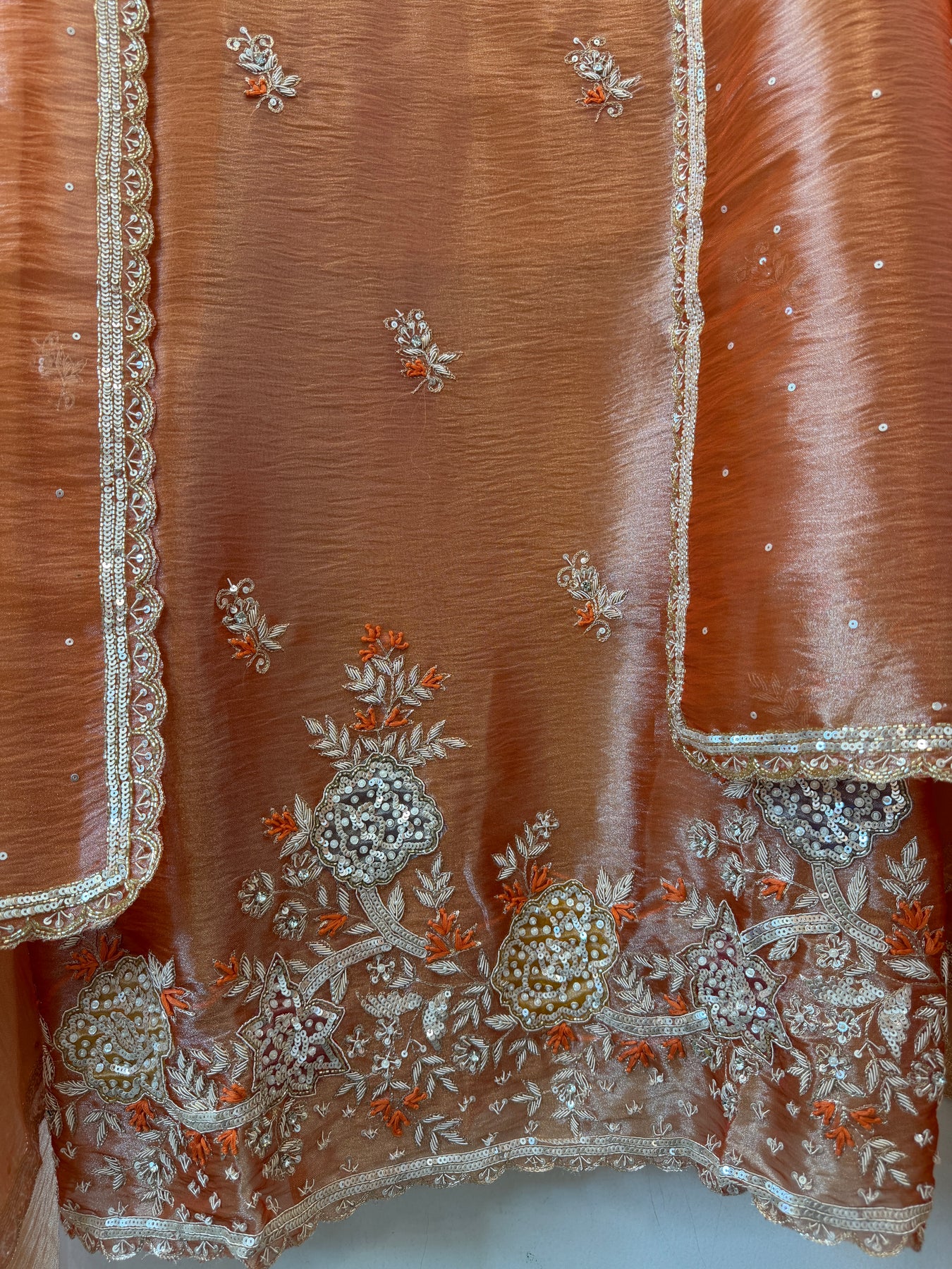 • Shirt: Tissue fabric shirt with handwork on the neckline and ghera, featuring dabka and sequin detailing