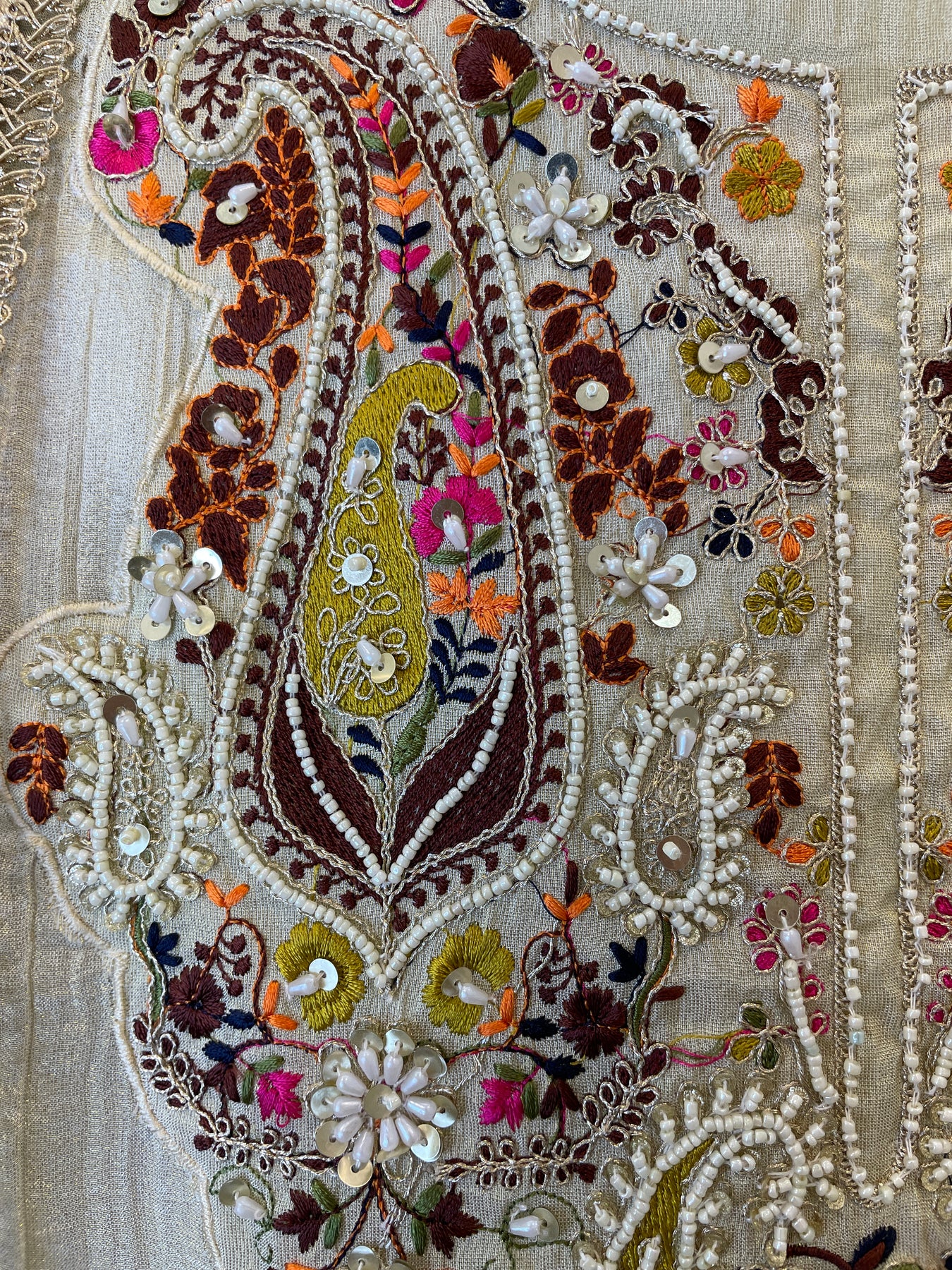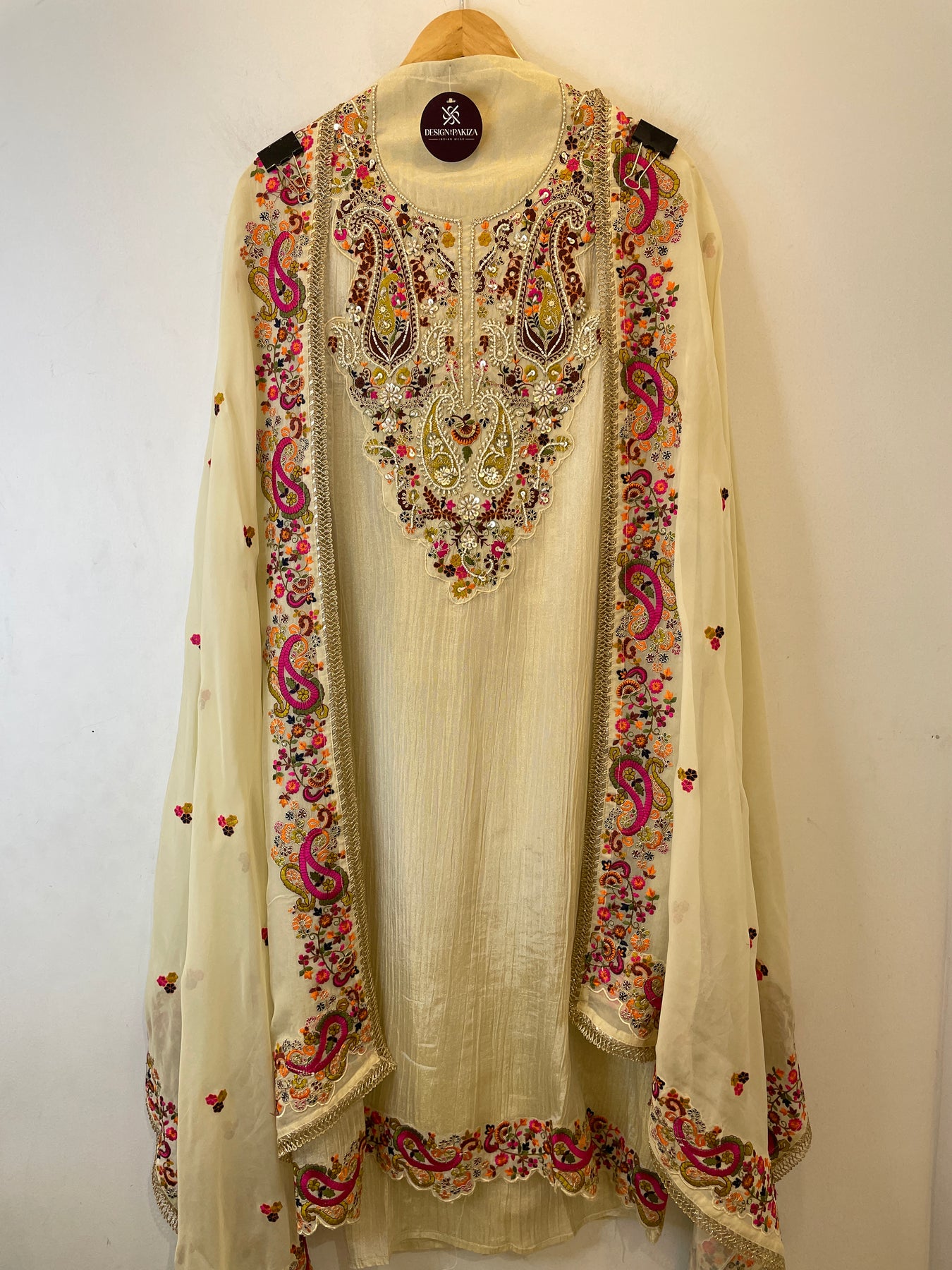 Shirt: Crush tissue shirt with thread embroidered neckline enhanced with pearl and sequin work; ghera finished with embroidery and cutwork