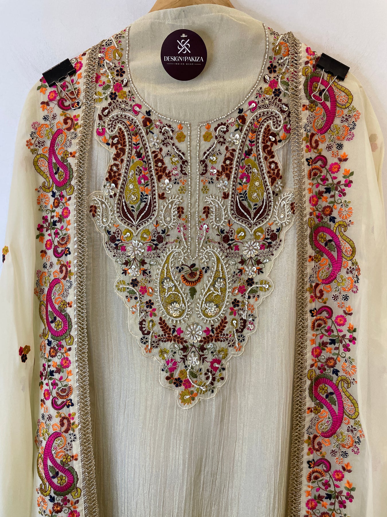 Dupatta: Organza dupatta with embroidery, lace finishing, and scattered embroidered bootis