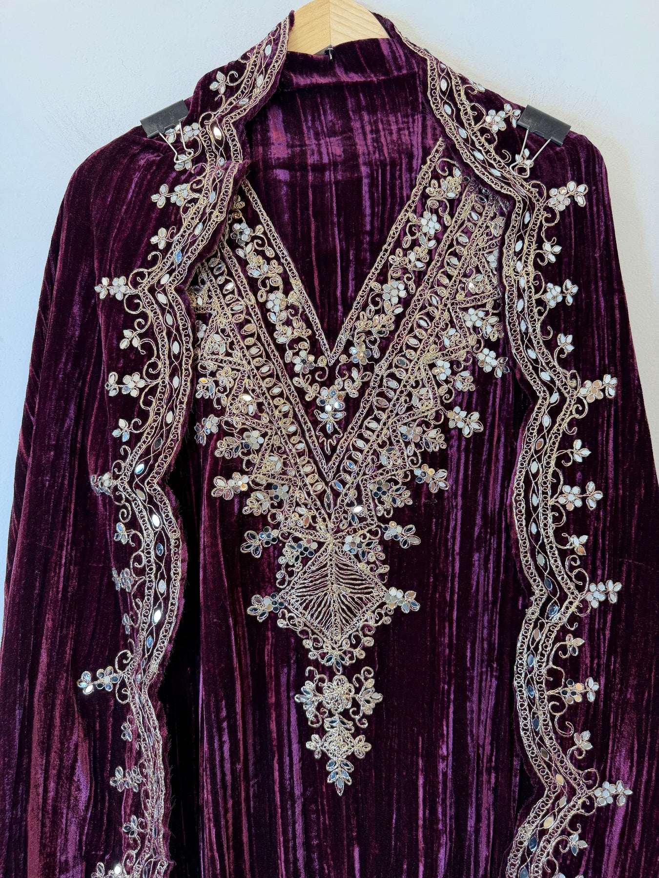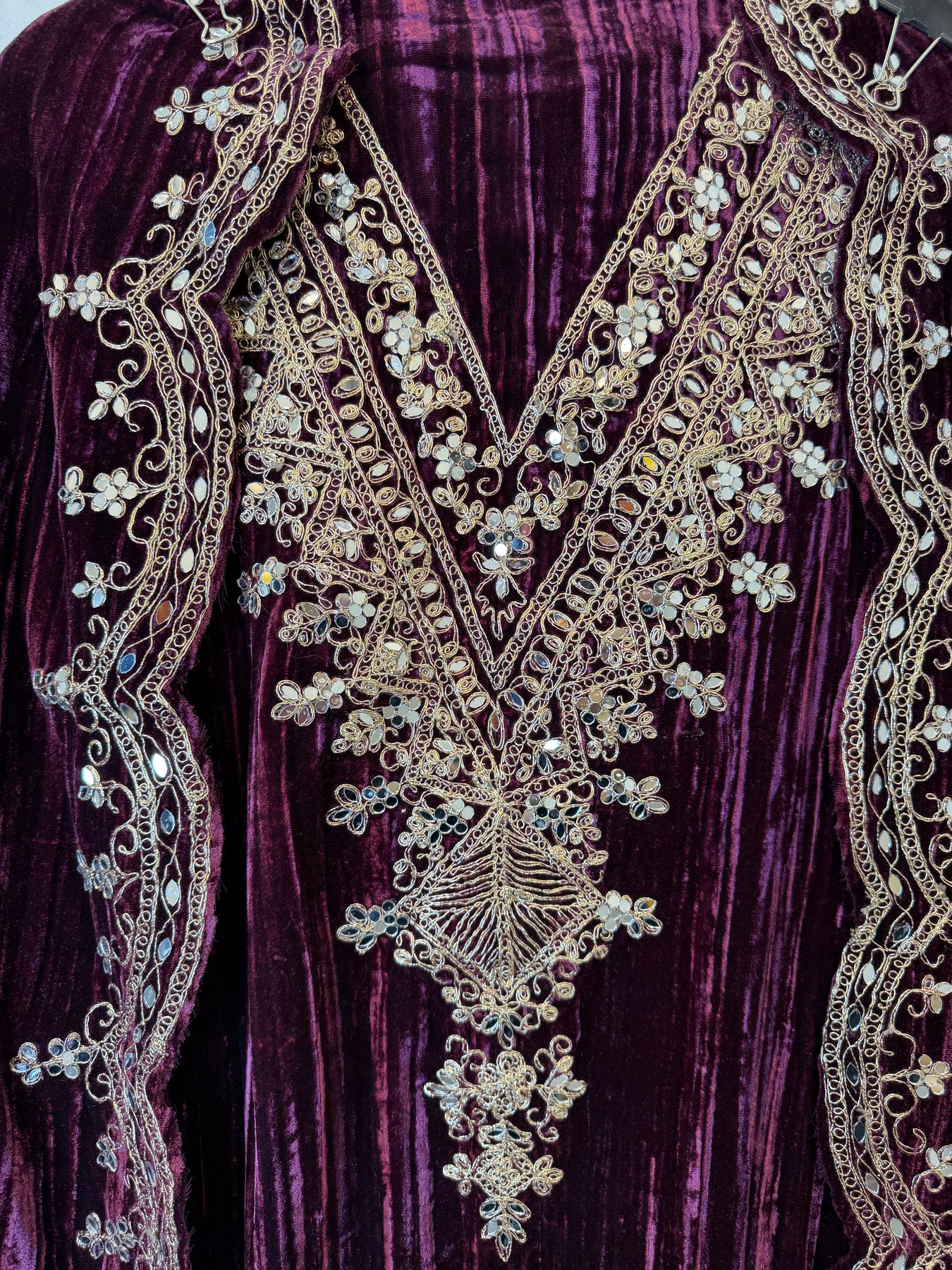 • Shirt: Crushed velvet shirt with dori and mirror work on the neckline for a refined traditional touch