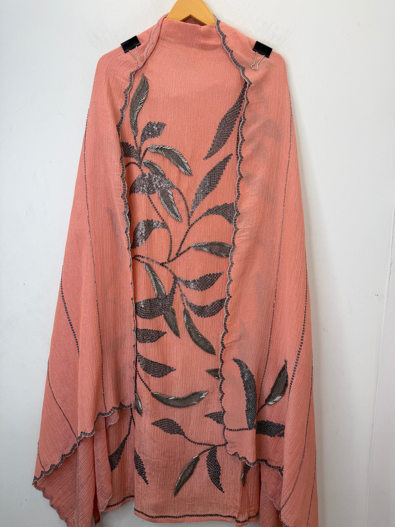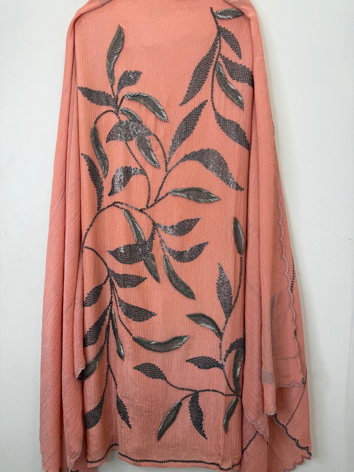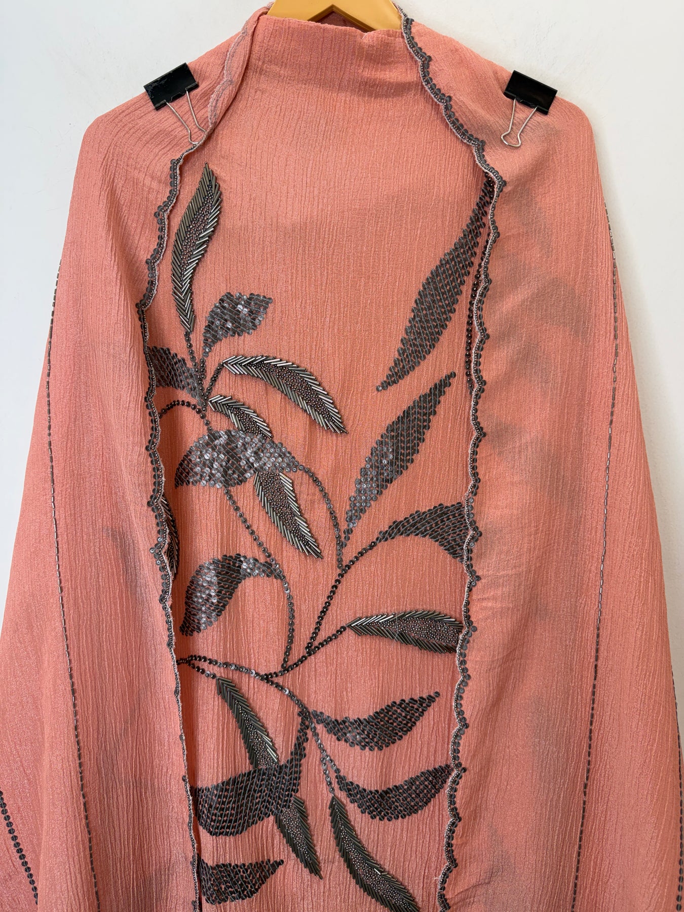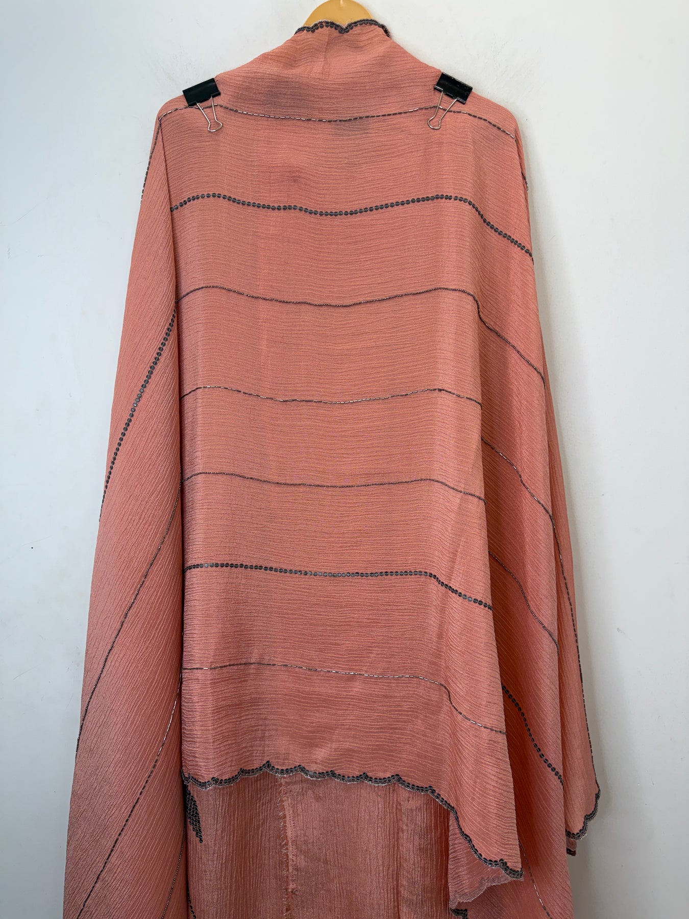 Dupatta: Crushed tissue dupatta featuring handworked scalloped borders and all-over handwork detailing
