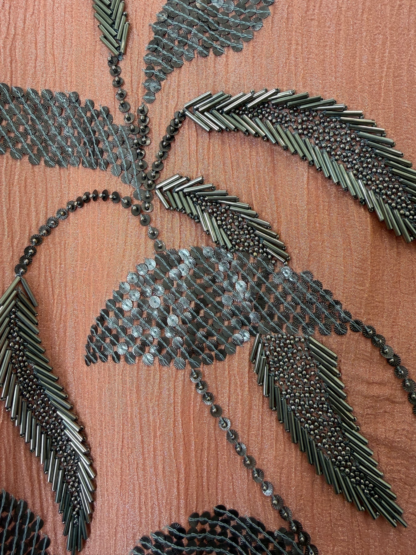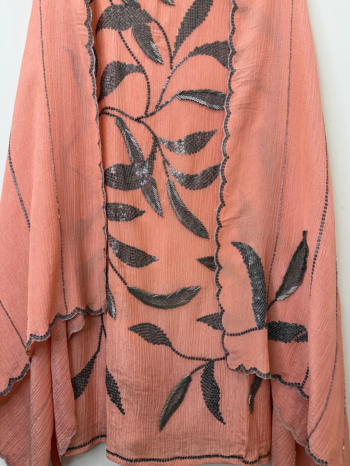 Shirt: Crushed tissue shirt with metallic handwork all over; sleeves also embellished with matching handwork