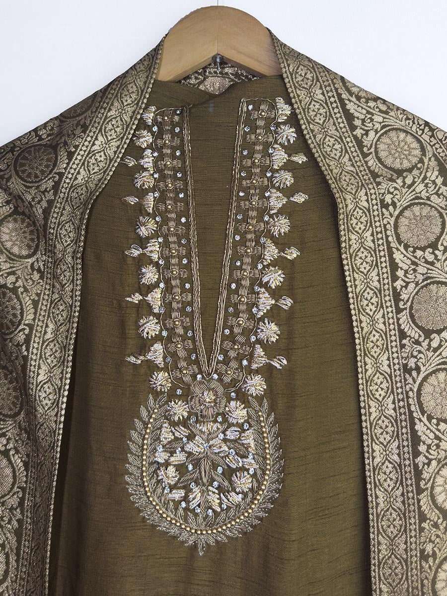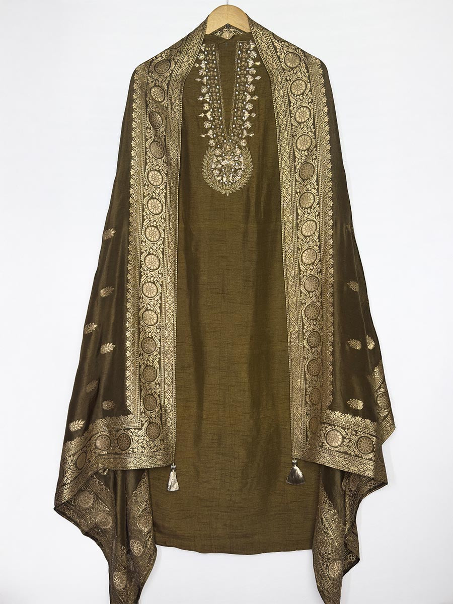 Includes: Unstitched kurta, dupatta, and silk bottom.