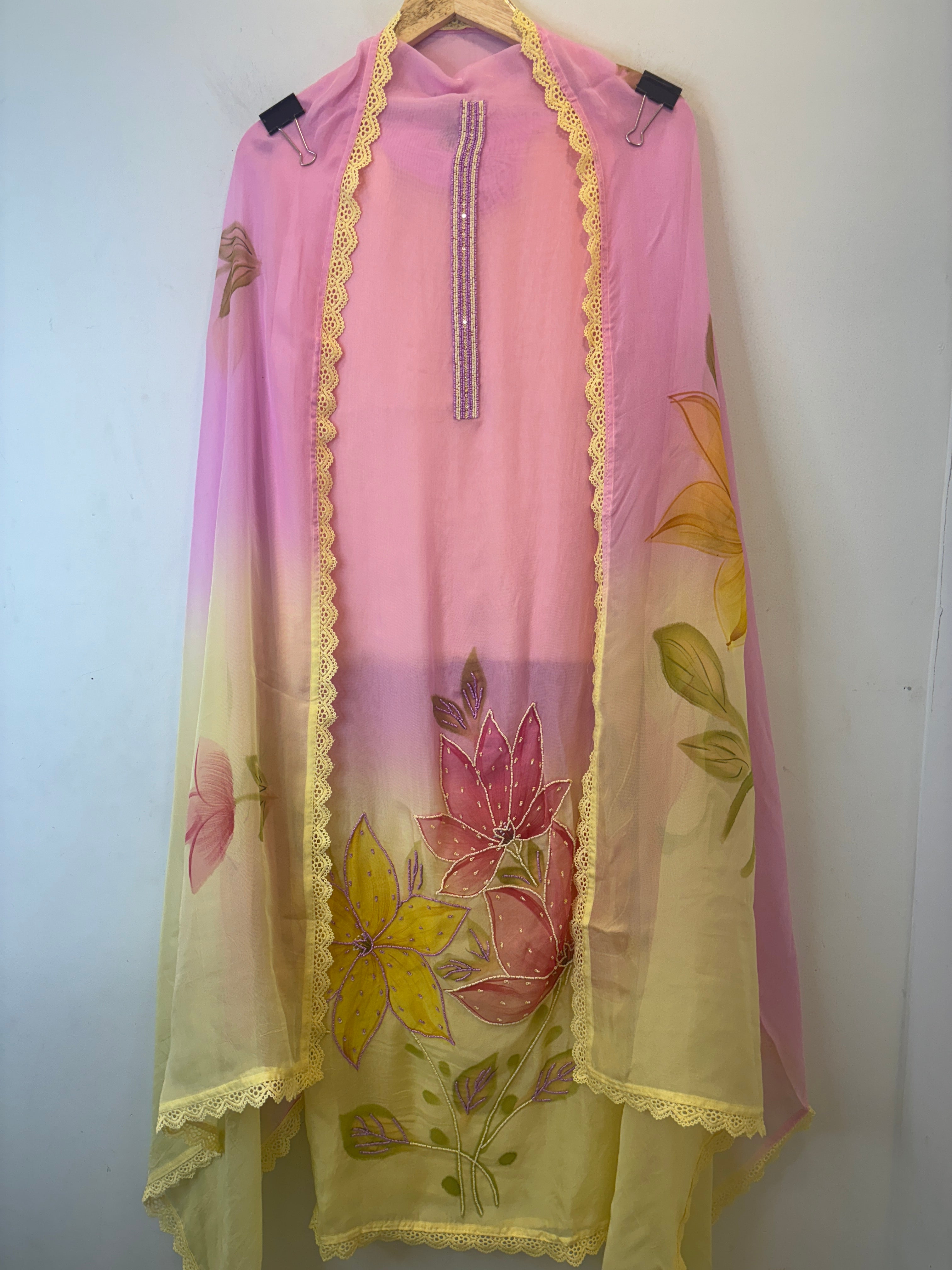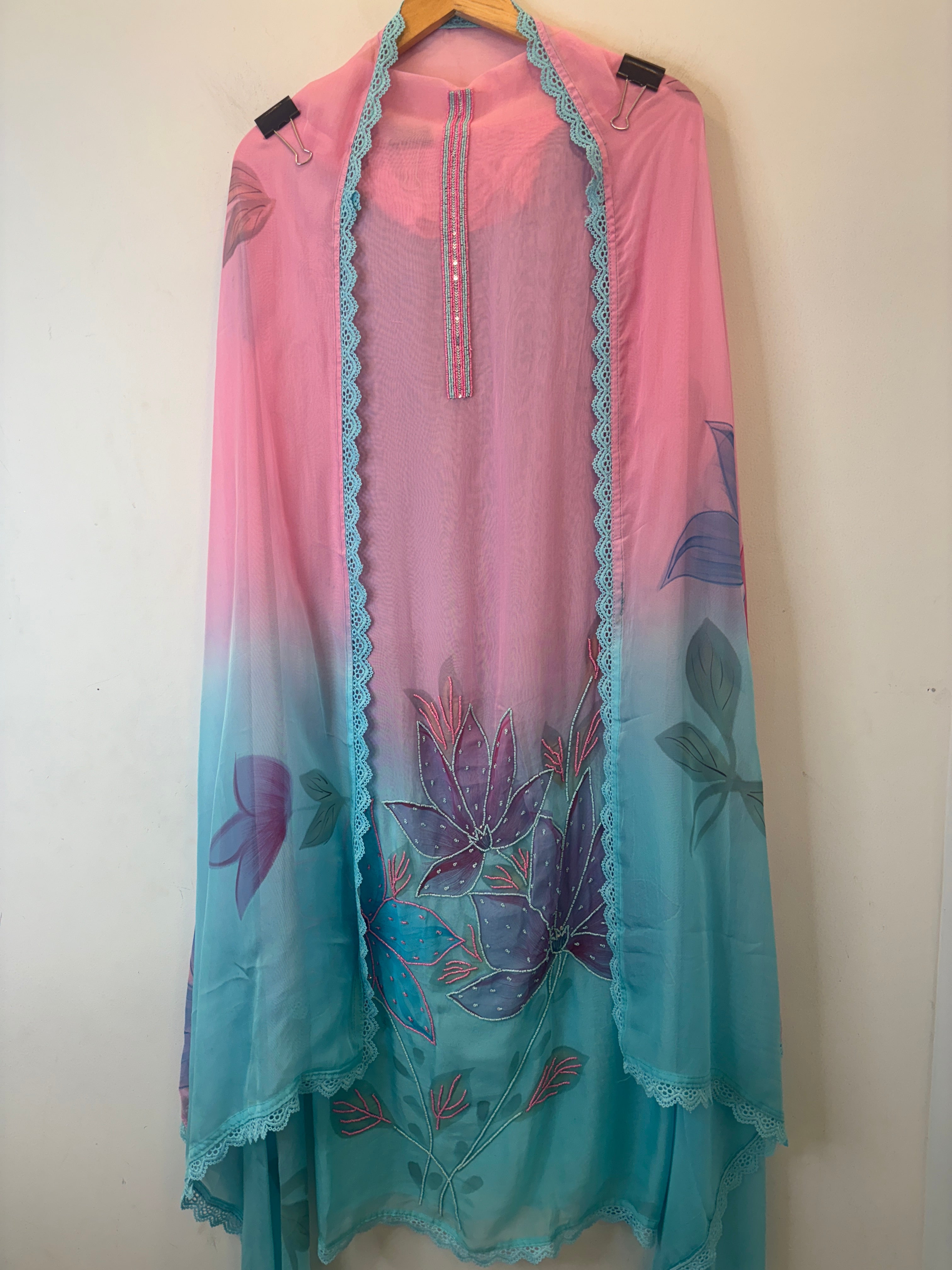 Dupatta: Organza dupatta in ombre brush-painted style with lace finishing all over