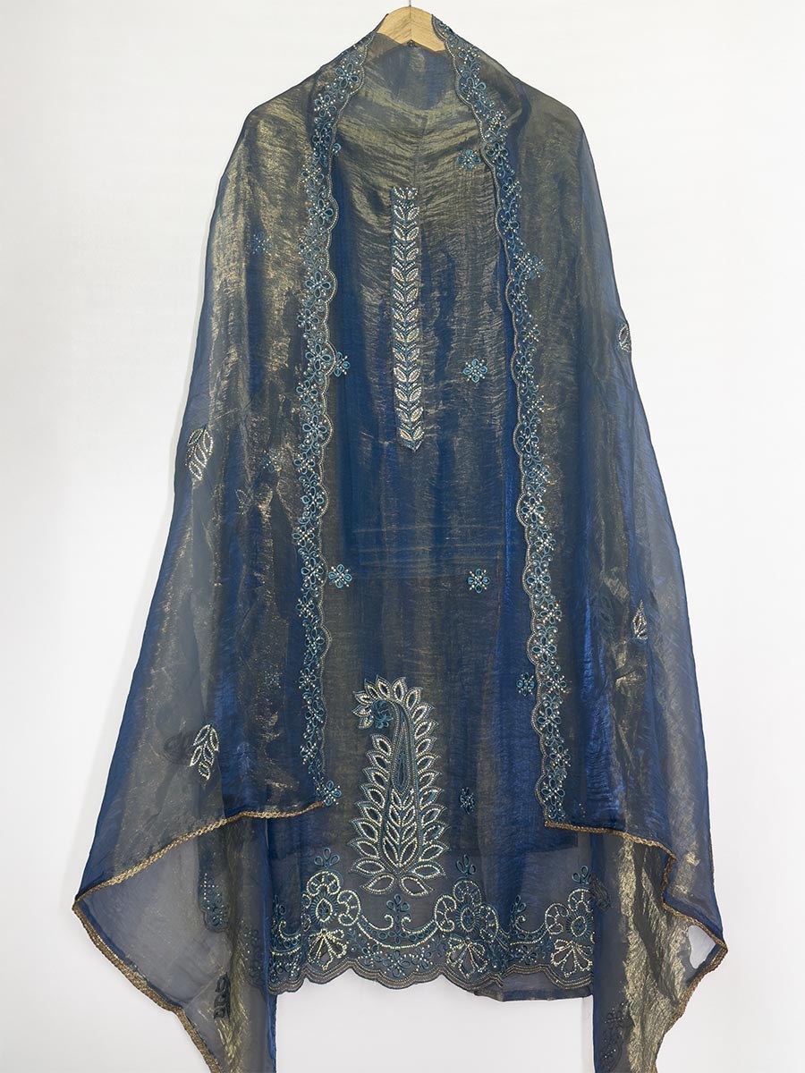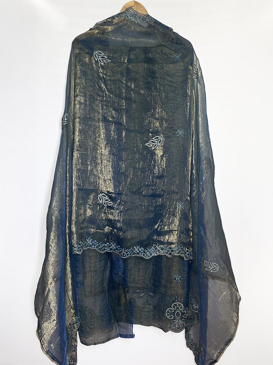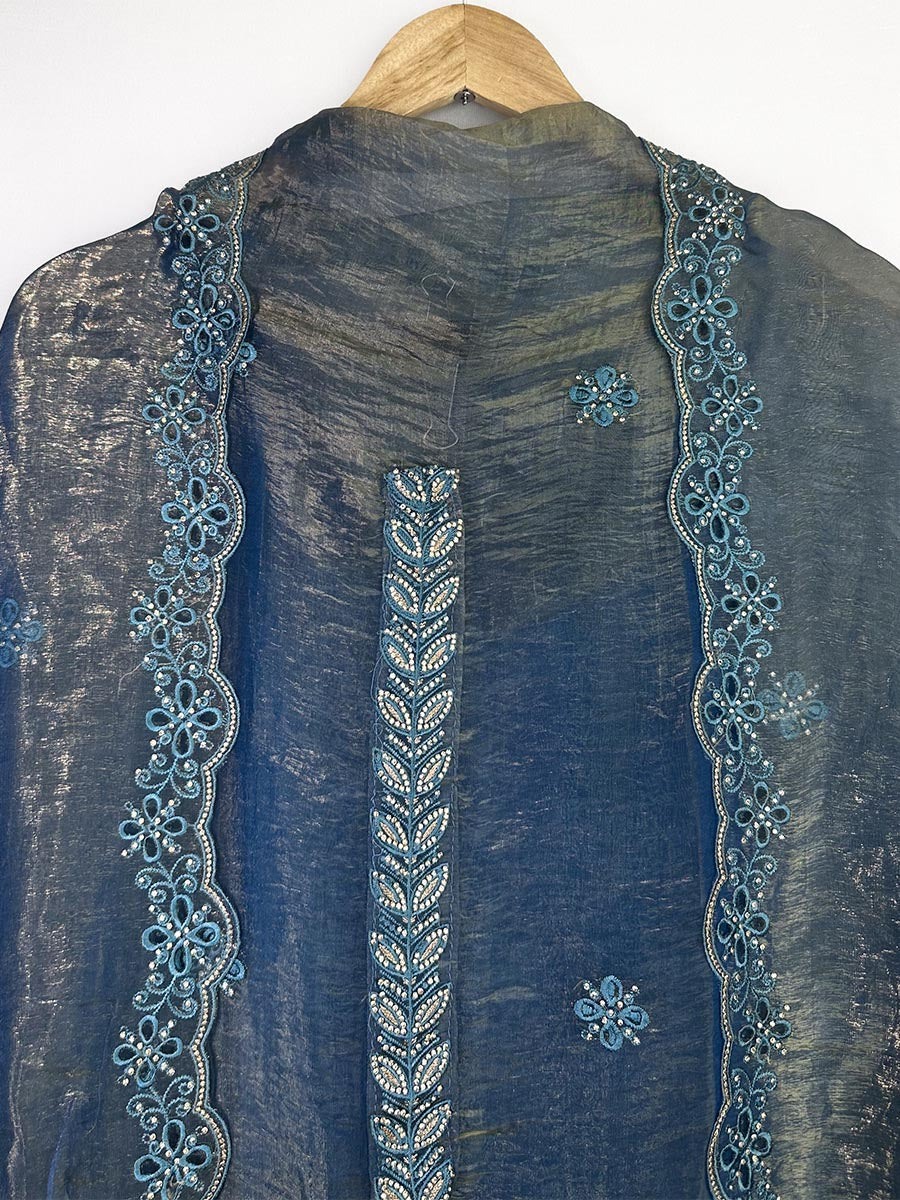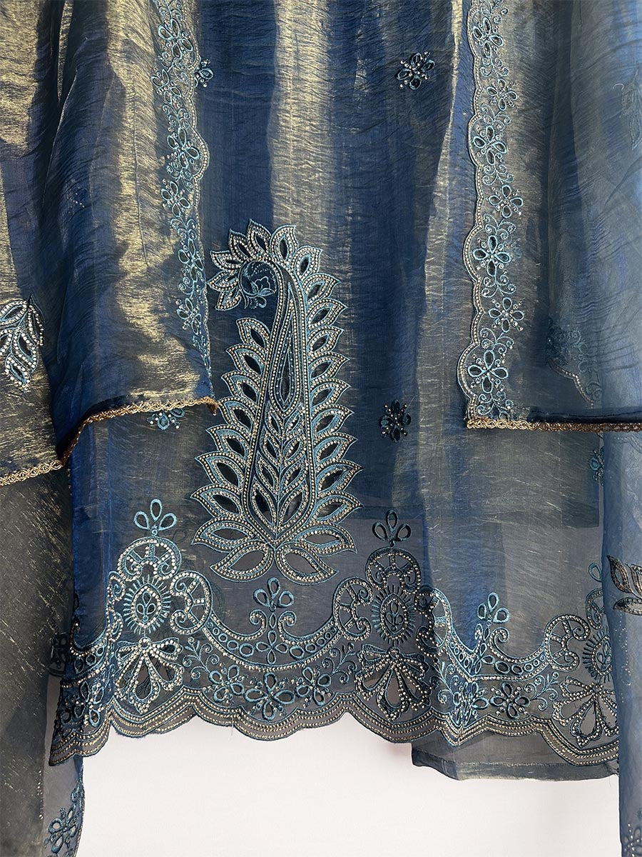 • Shirt: Tissue fabric with intricate neckline work highlighted with stones, and ghera featuring laser cutwork with stone accents