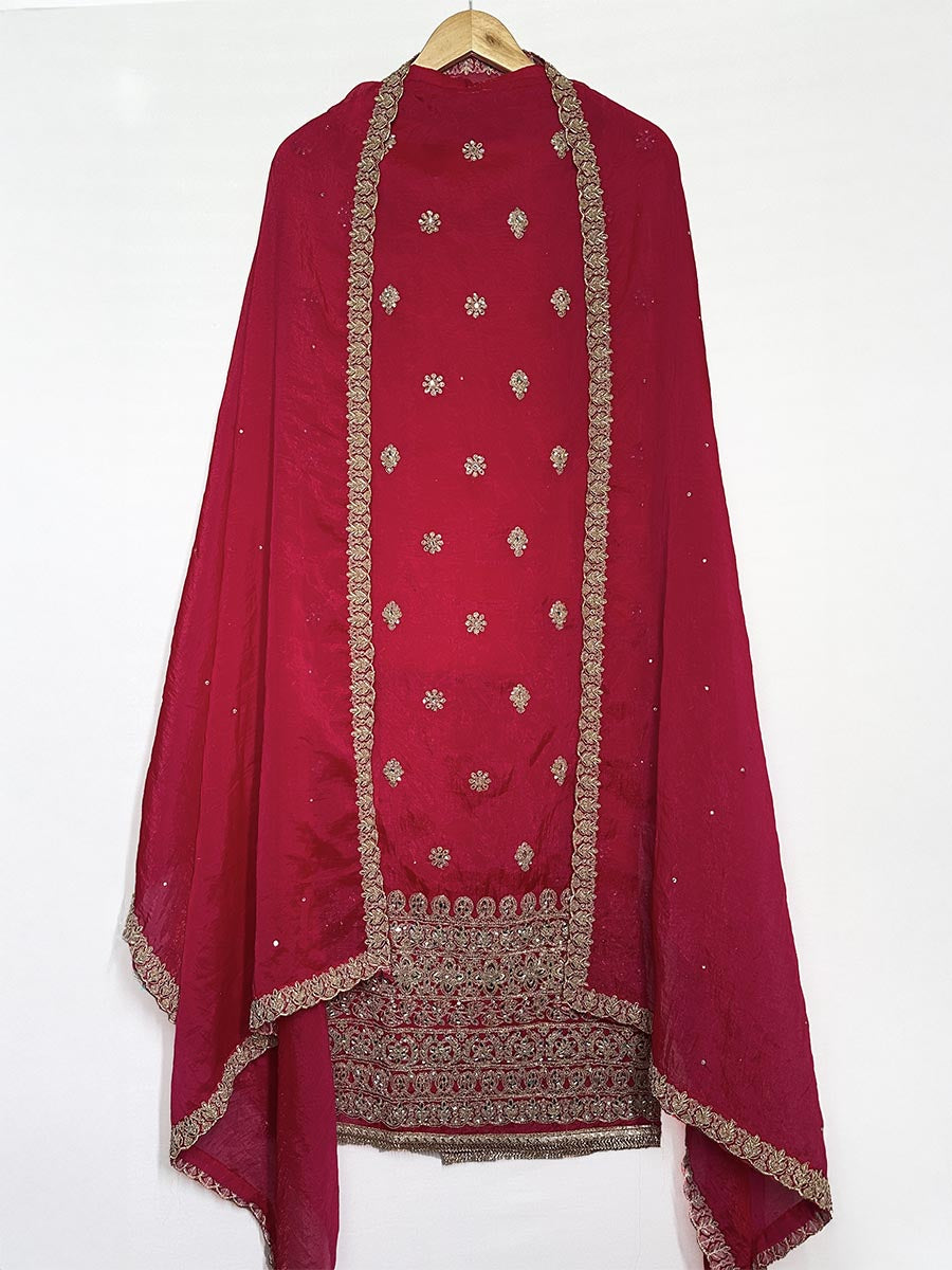 - Set includes an unstitched kurta, dupatta, and silk bottom