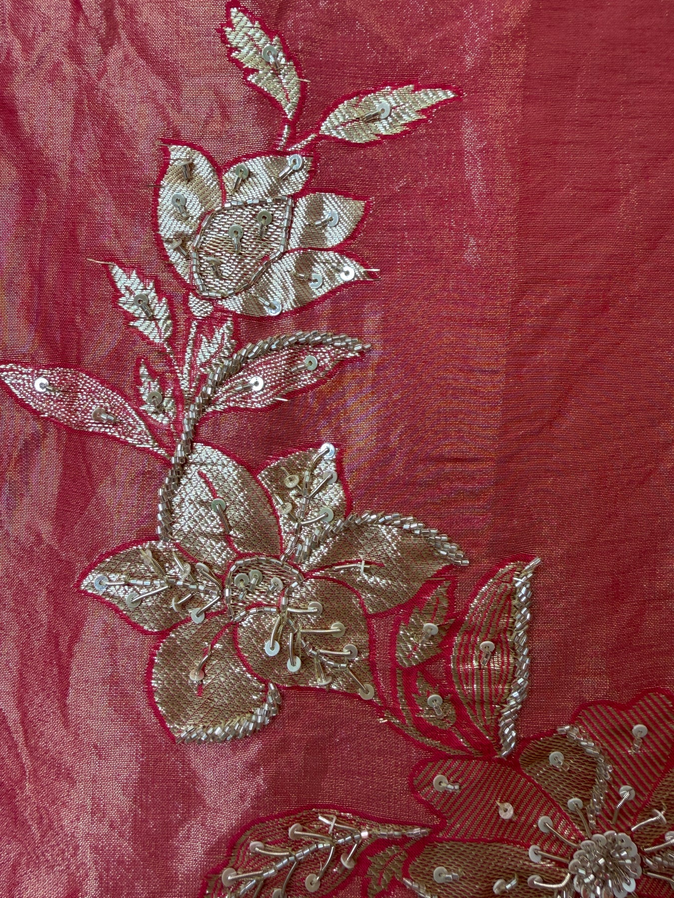 • Dupatta: Tissue organza dupatta featuring Banarasi woven flowers with handwork highlights