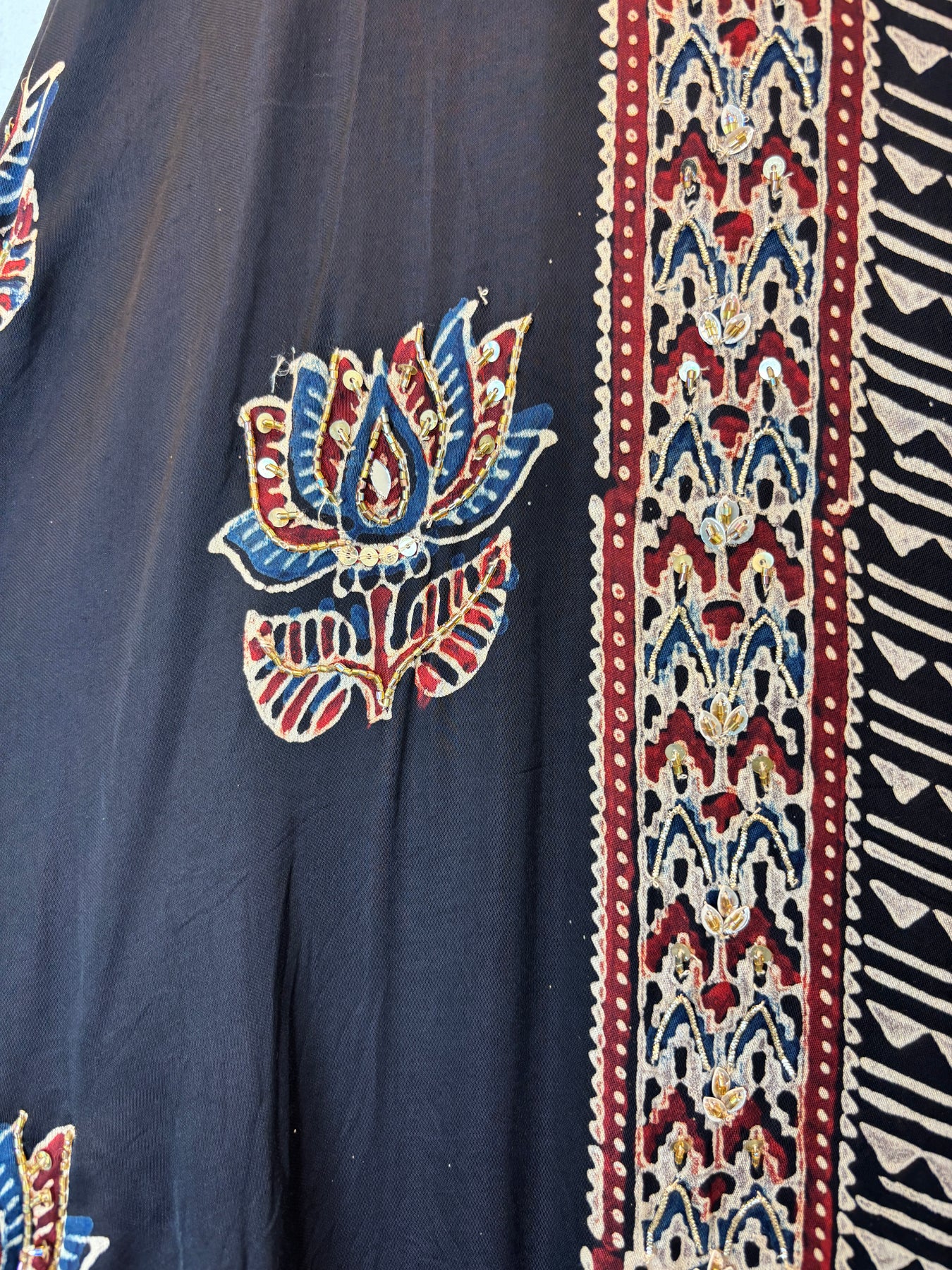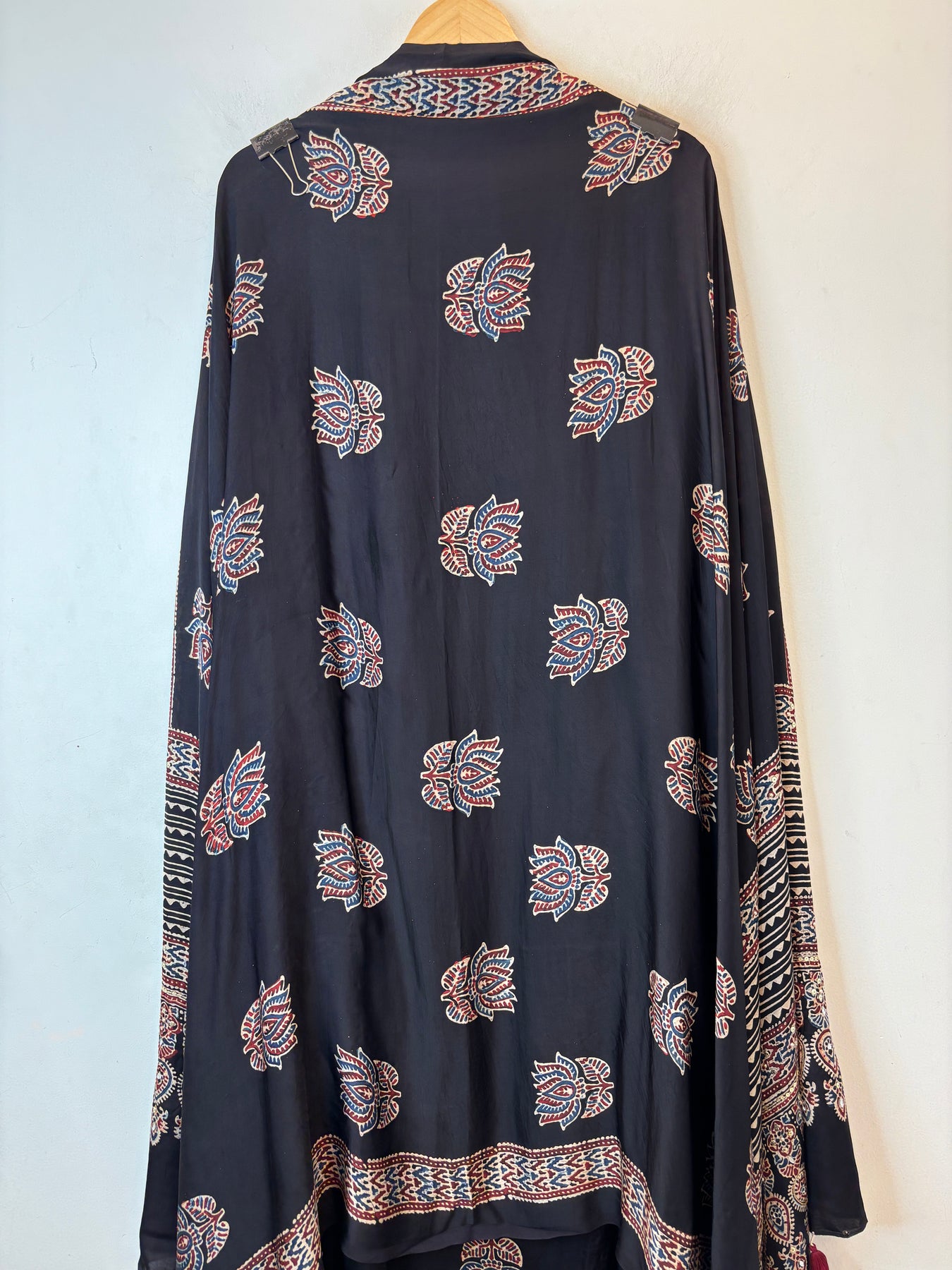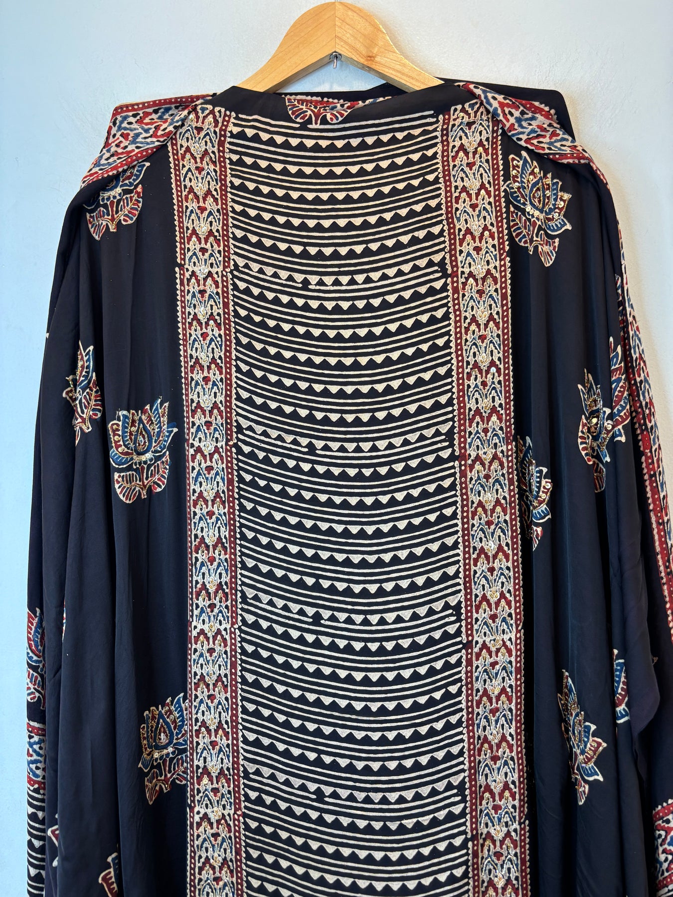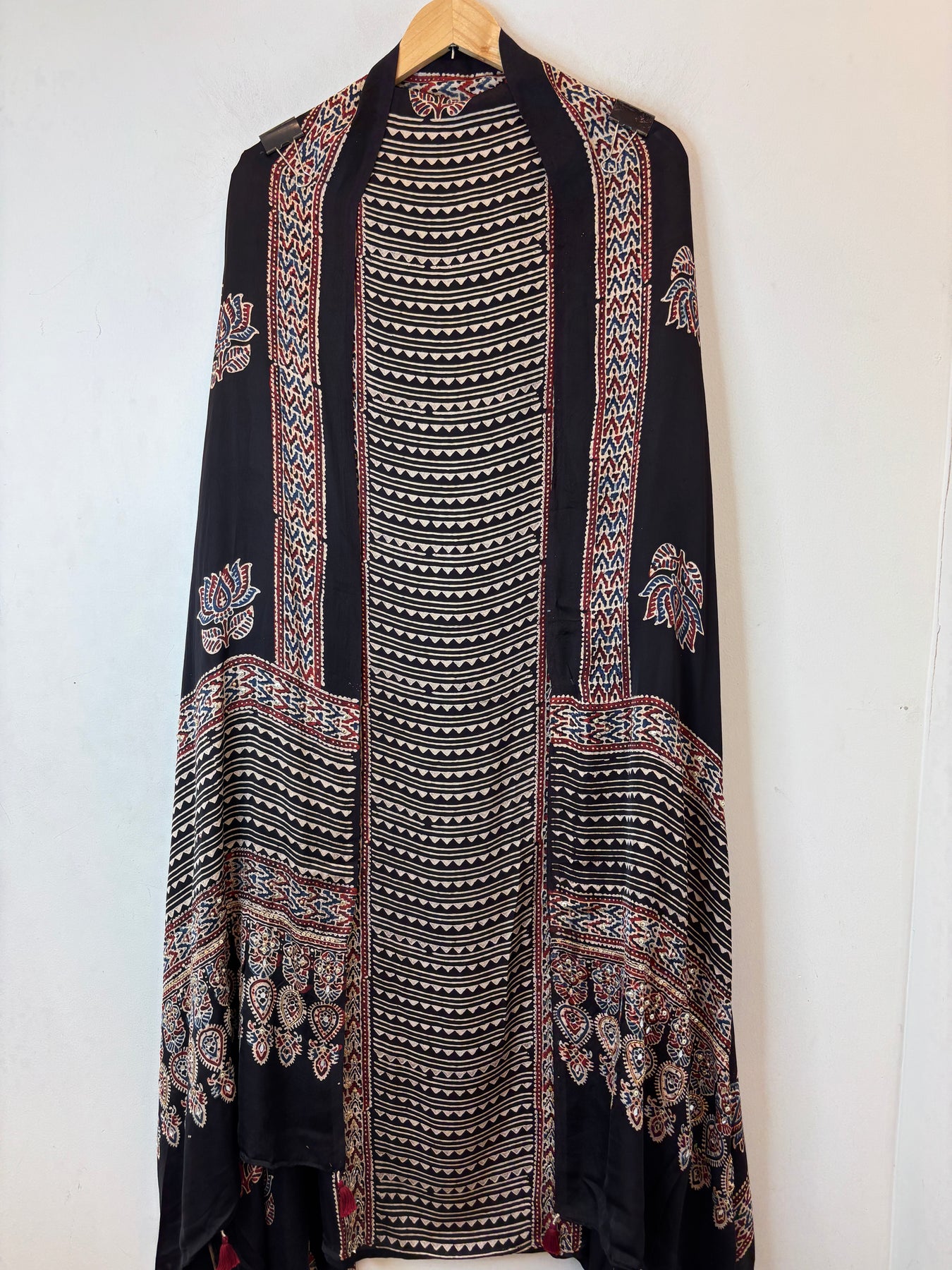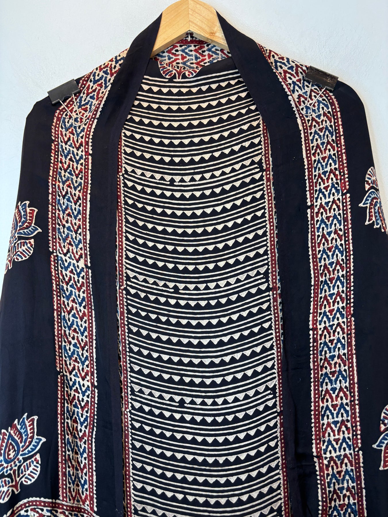 Shirt: Pure Ajrakh modal fabric shirt crafted using eco-friendly and chemical-free processes. The fabric is sustainably made by skilled artisans and features elegant lotus-inspired detailing, reflecting traditional craftsmanship with a modern touch.