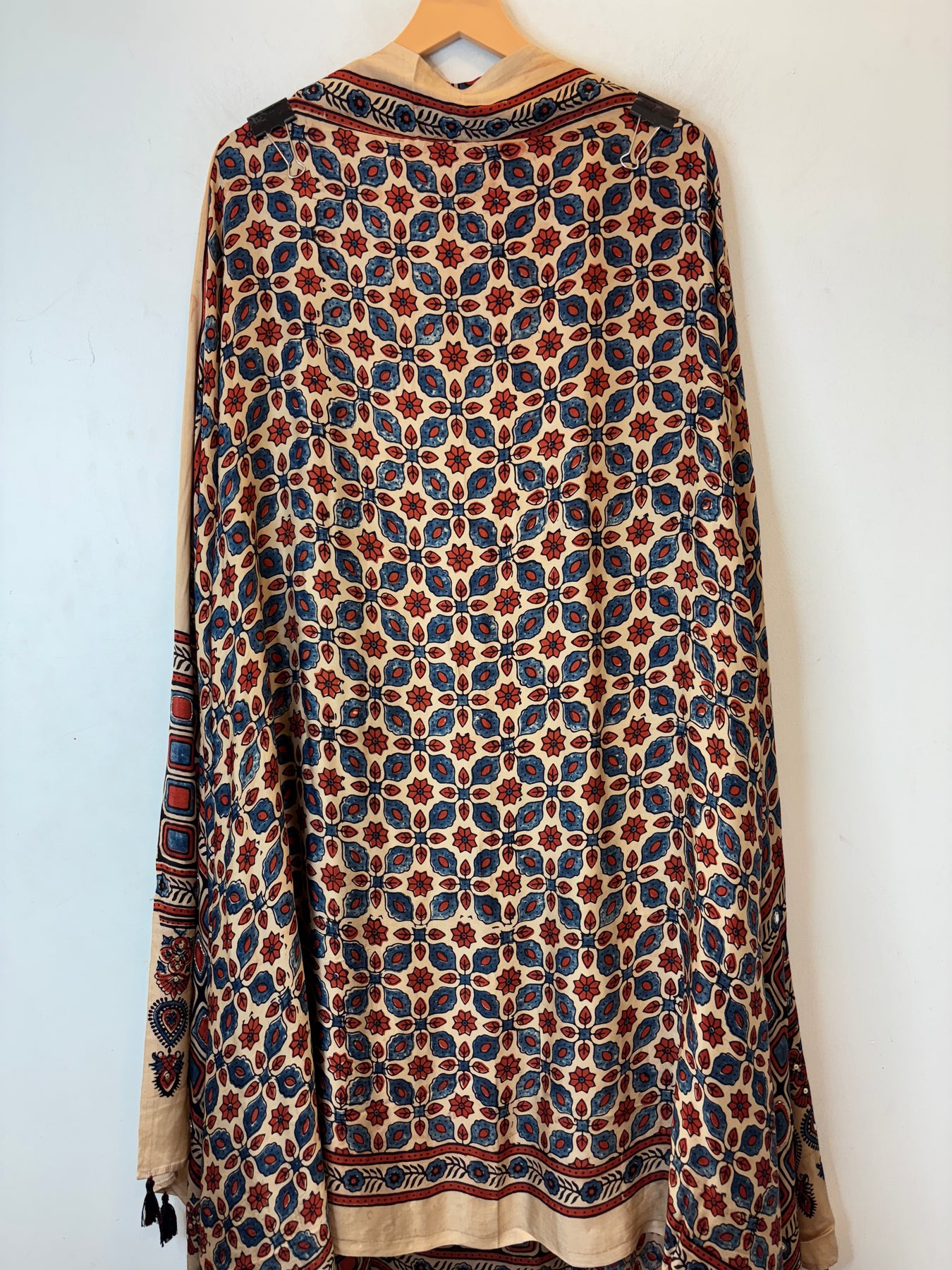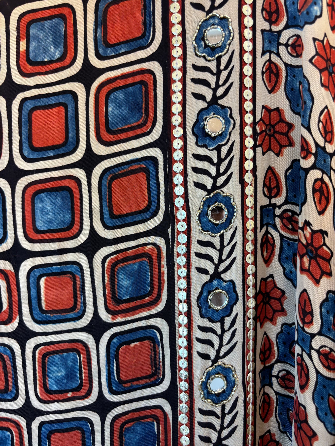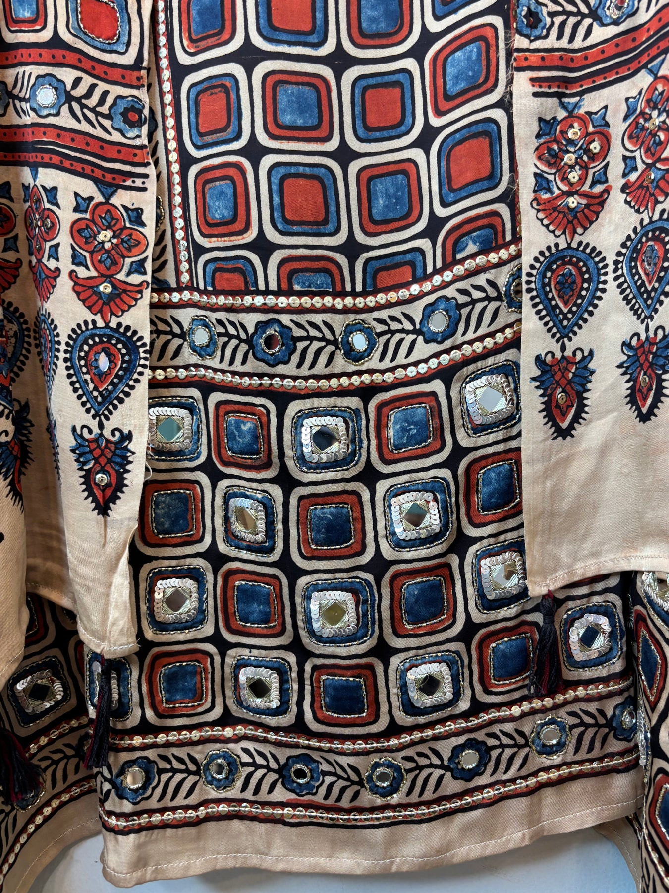 Shirt: Pure Ajrakh modal fabric shirt crafted using eco-friendly and chemical-free processes. The fabric is sustainably made by skilled artisans and features elegant lotus-inspired detailing, reflecting traditional craftsmanship with a modern touch. Mirror work also.