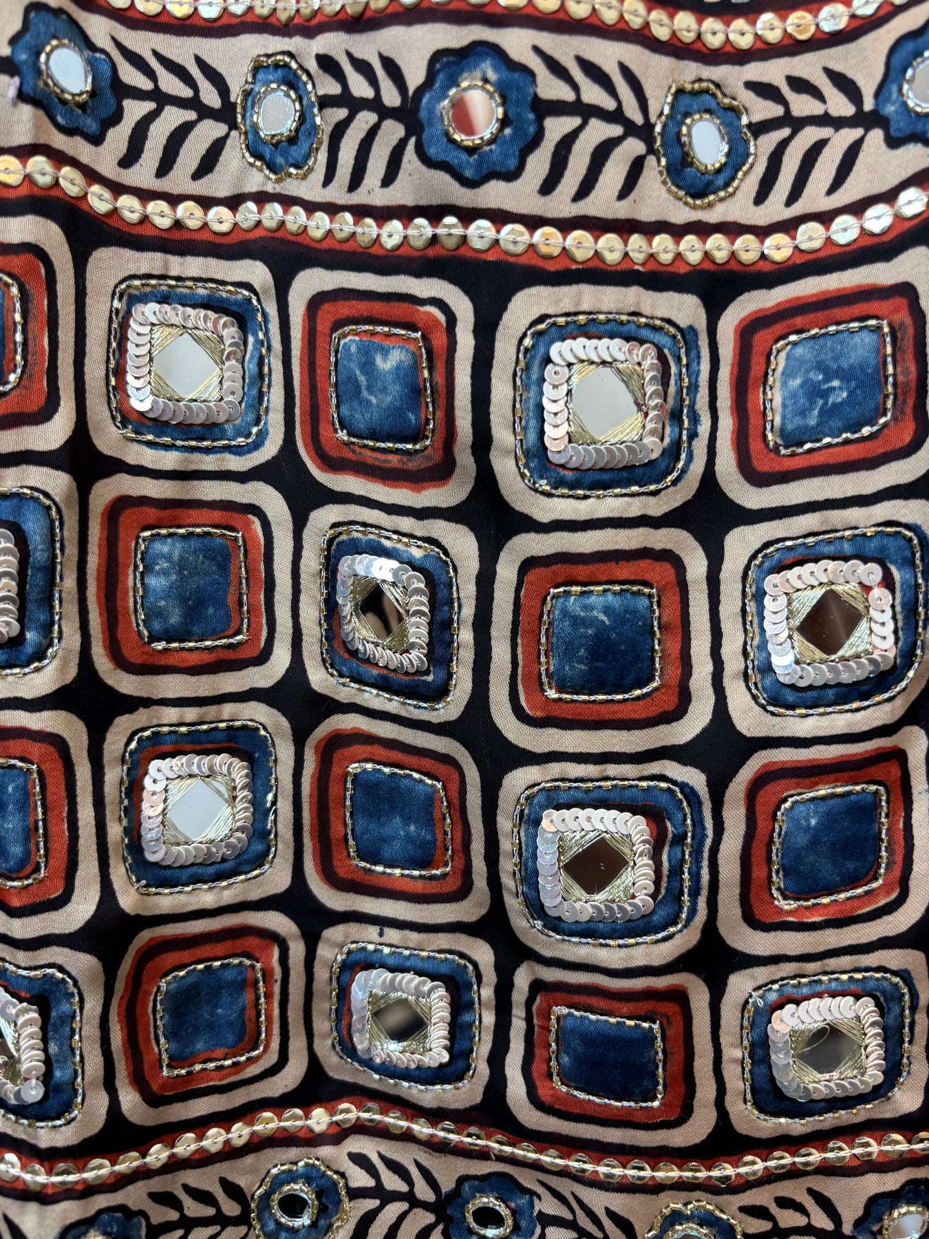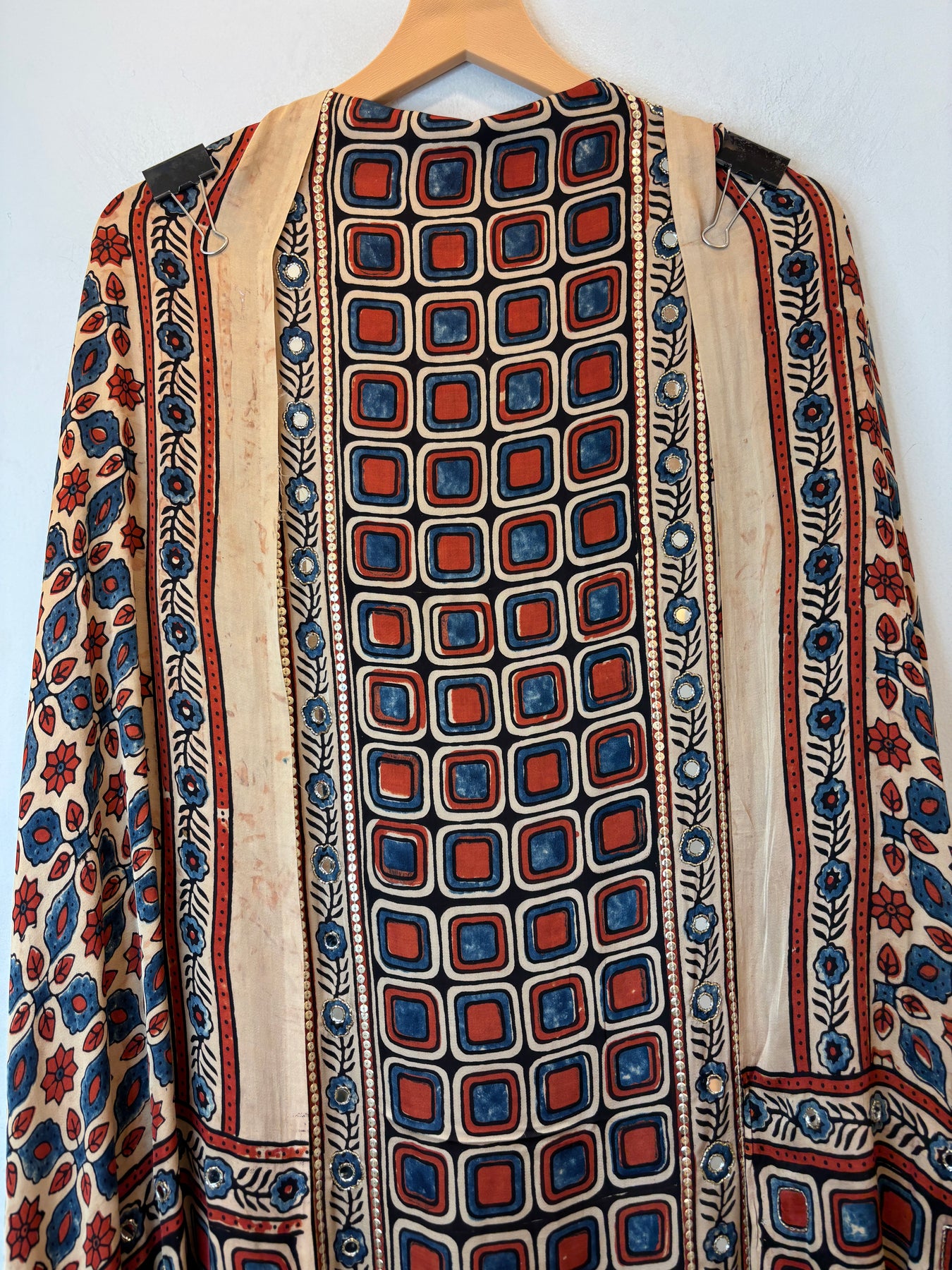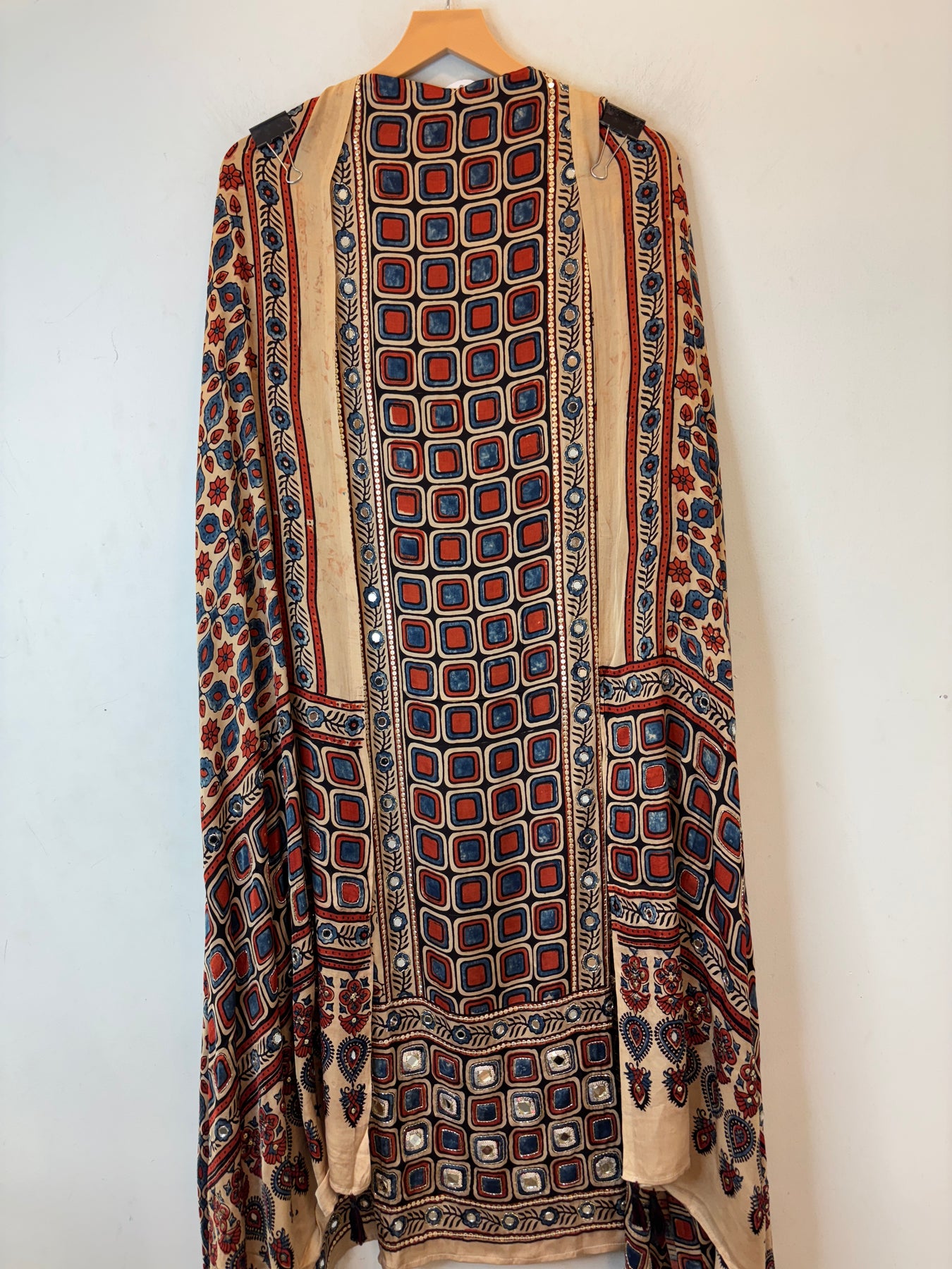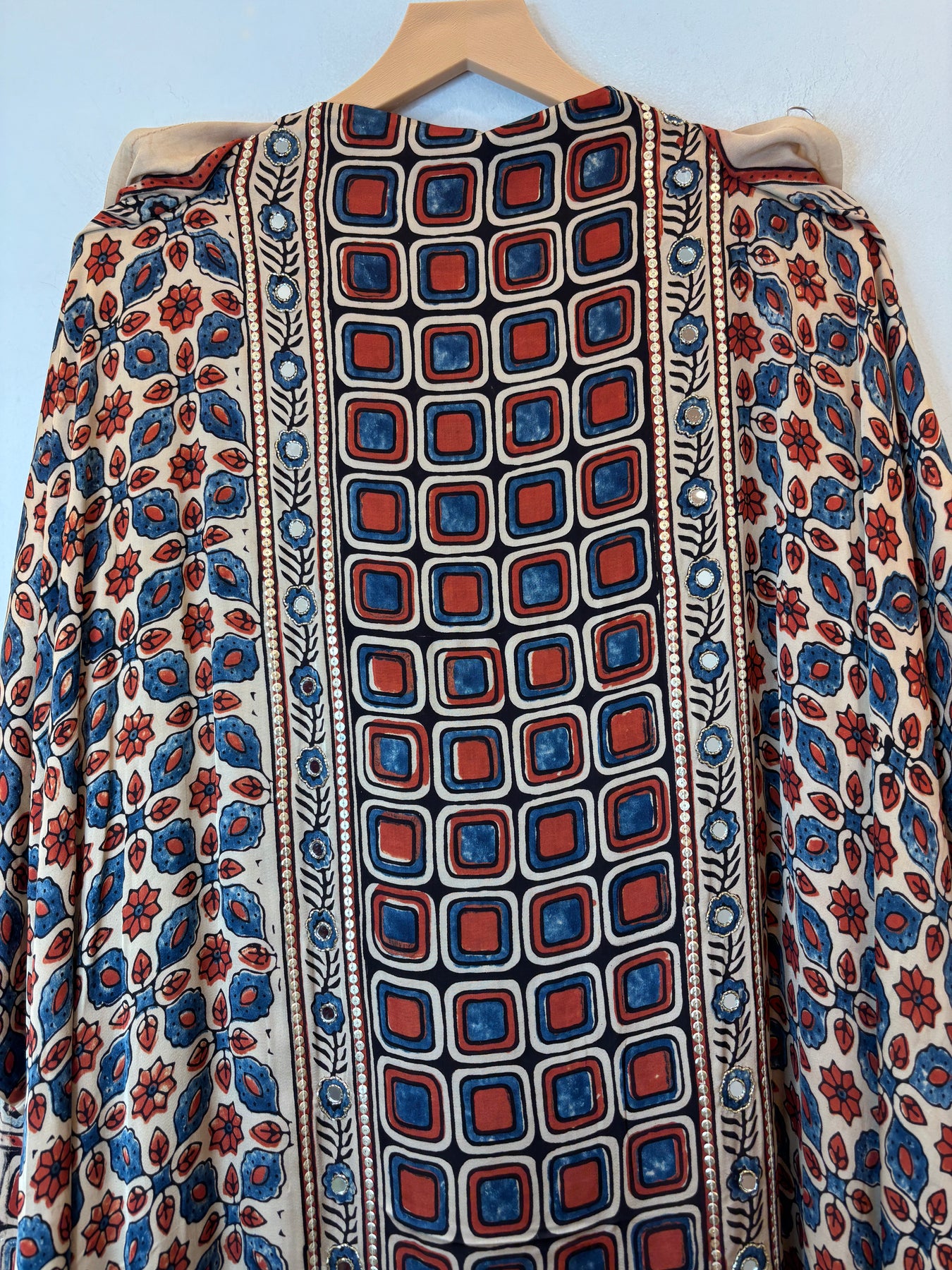 Shirt: Pure Ajrakh modal fabric shirt crafted using eco-friendly and chemical-free processes. The fabric is sustainably made by skilled artisans and features elegant lotus-inspired detailing, reflecting traditional craftsmanship with a modern touch. Mirror work also.