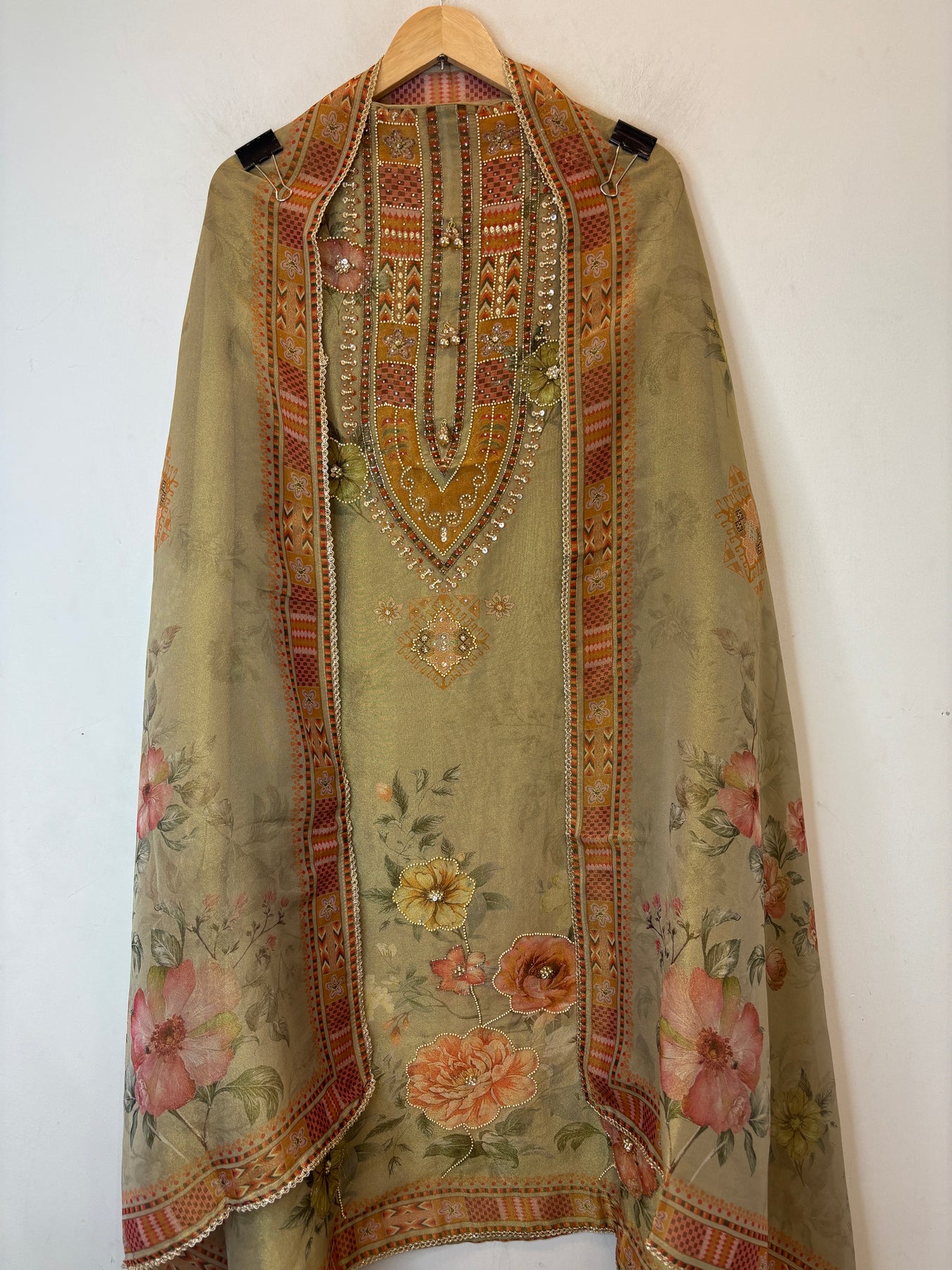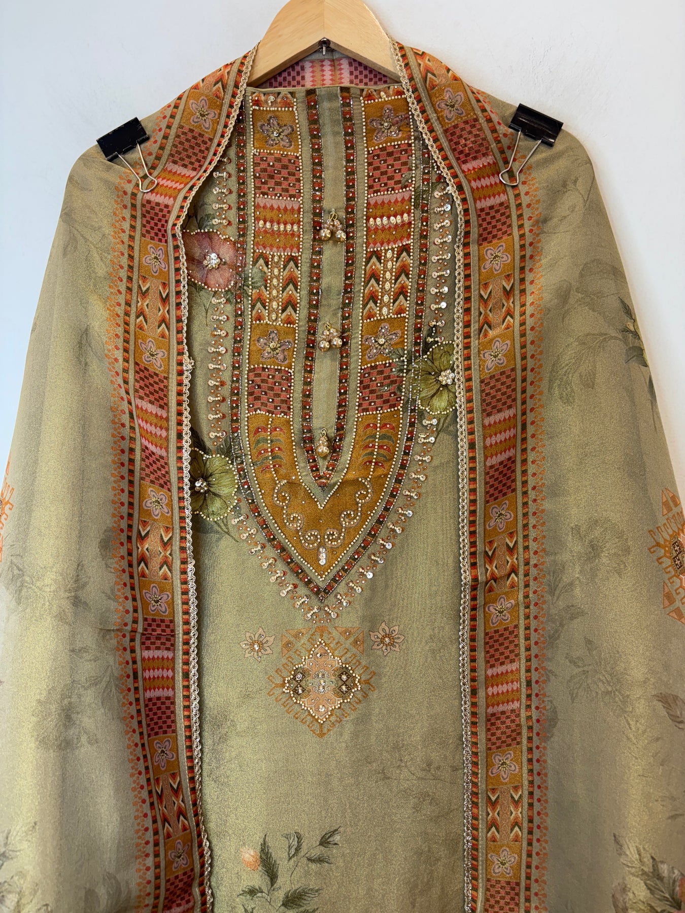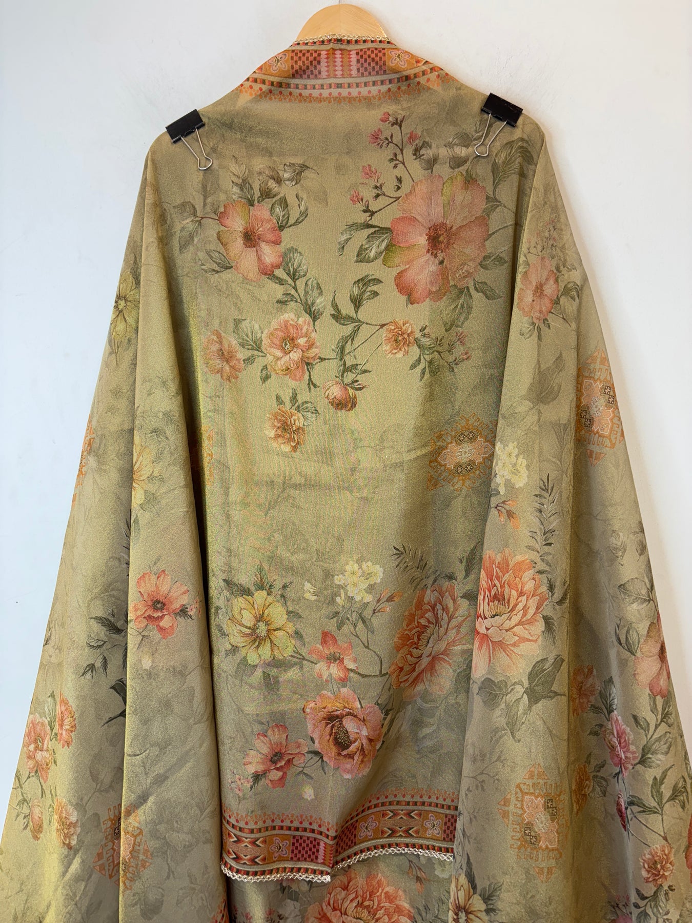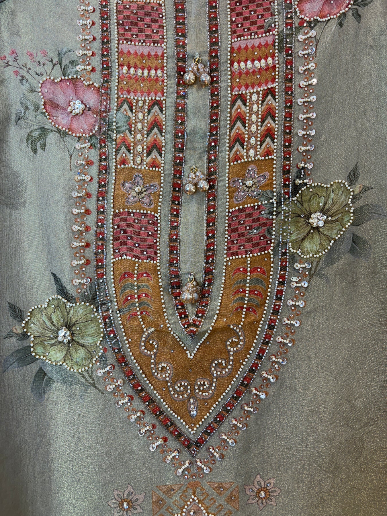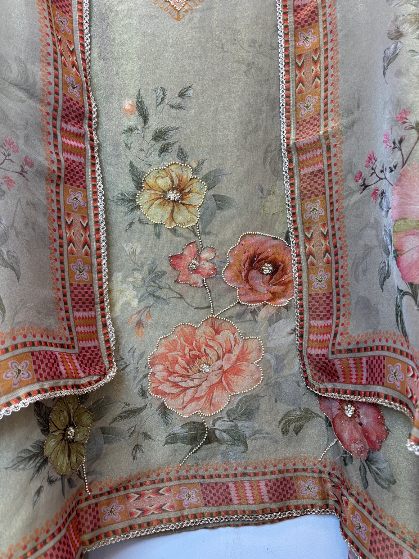 Shirt: Tissue fabric digitally printed shirt with neckline embellished in pearl and sequin handwork, finished with tassels; ghera highlighted with floral motifs and sequin detailing, completed with lace finishing