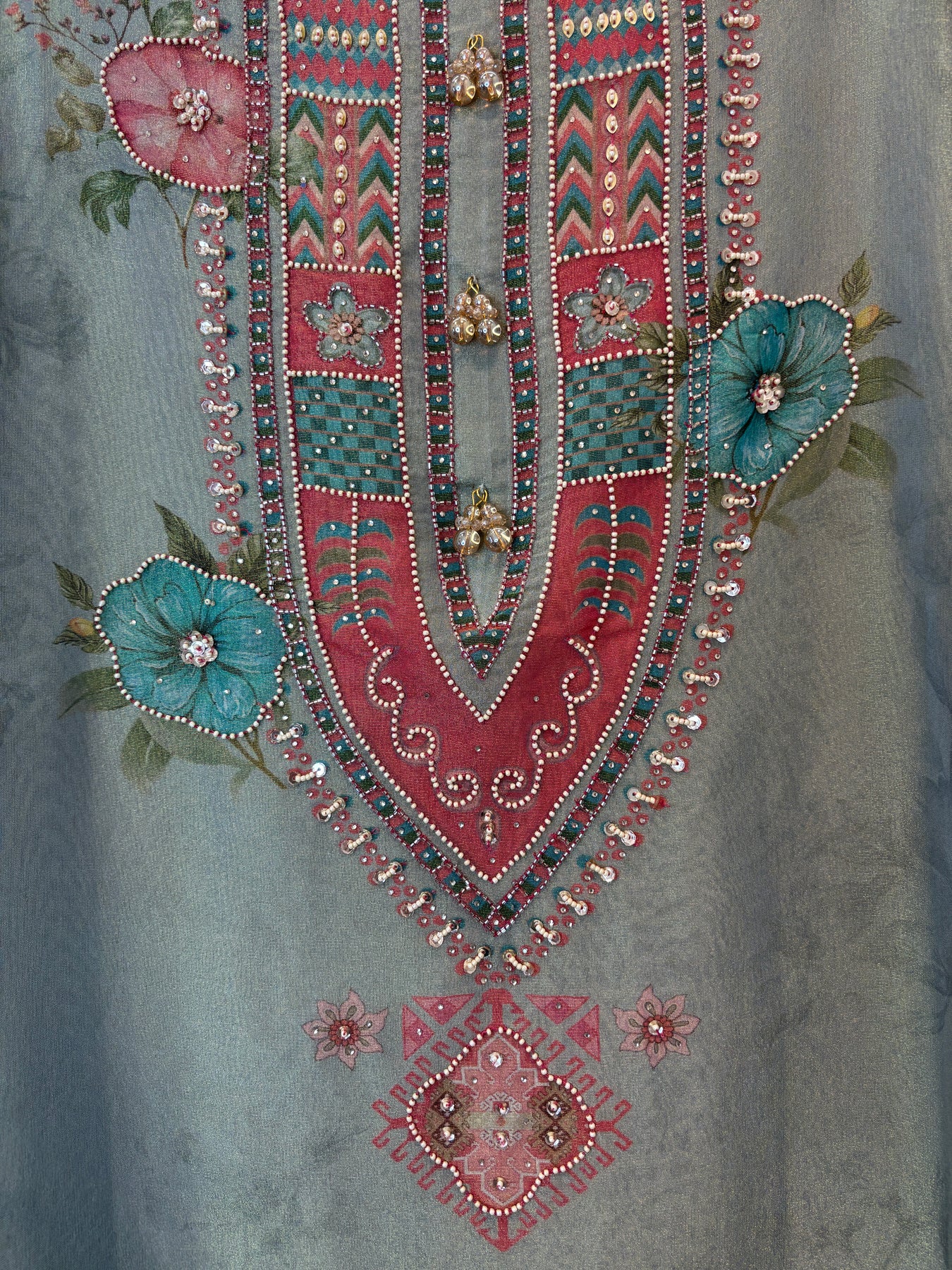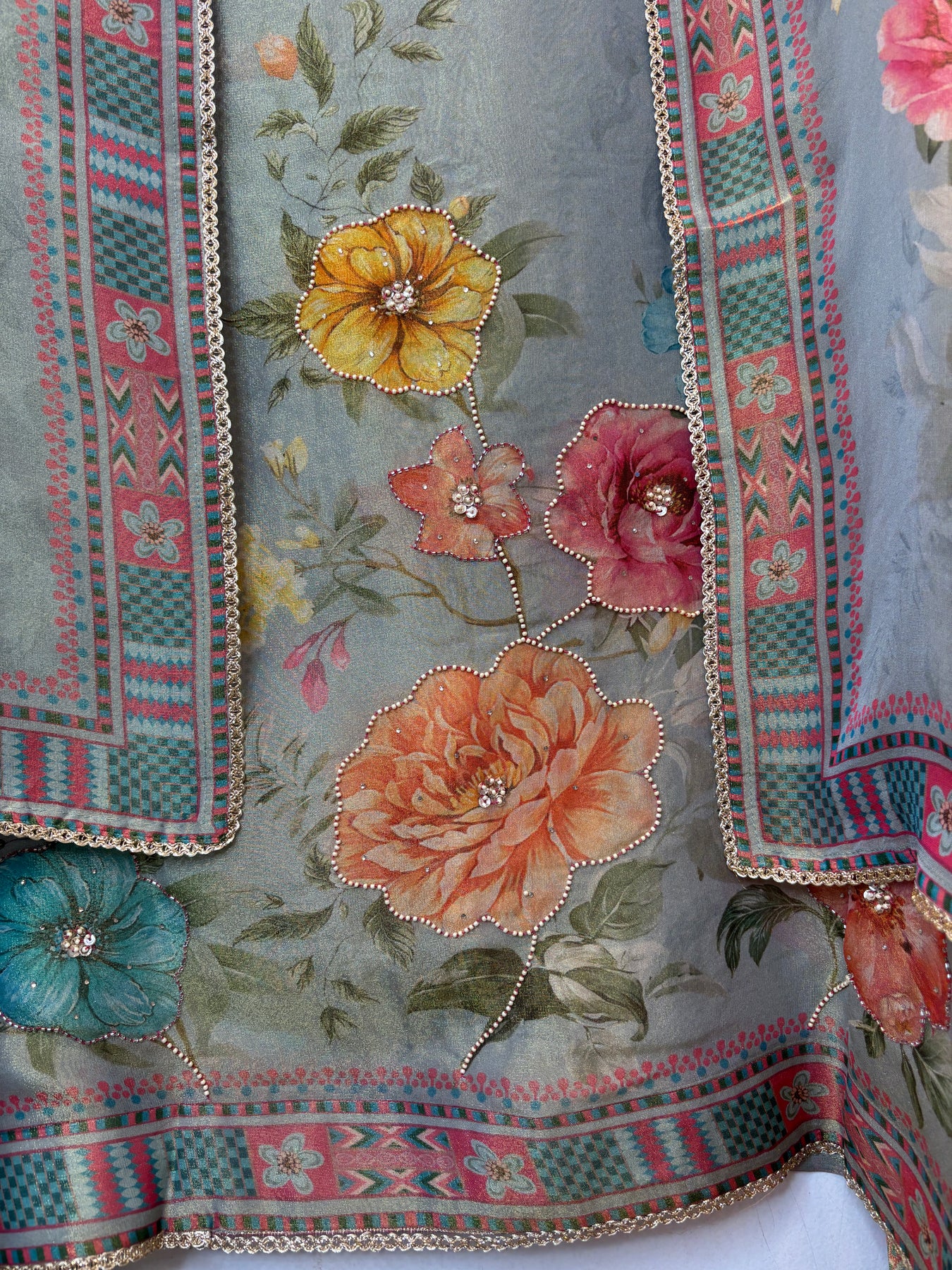 • Shirt: Tissue fabric digitally printed shirt with neckline embellished in pearl and sequin handwork, finished with tassels; ghera highlighted with floral motifs and sequin detailing, completed with lace finishing