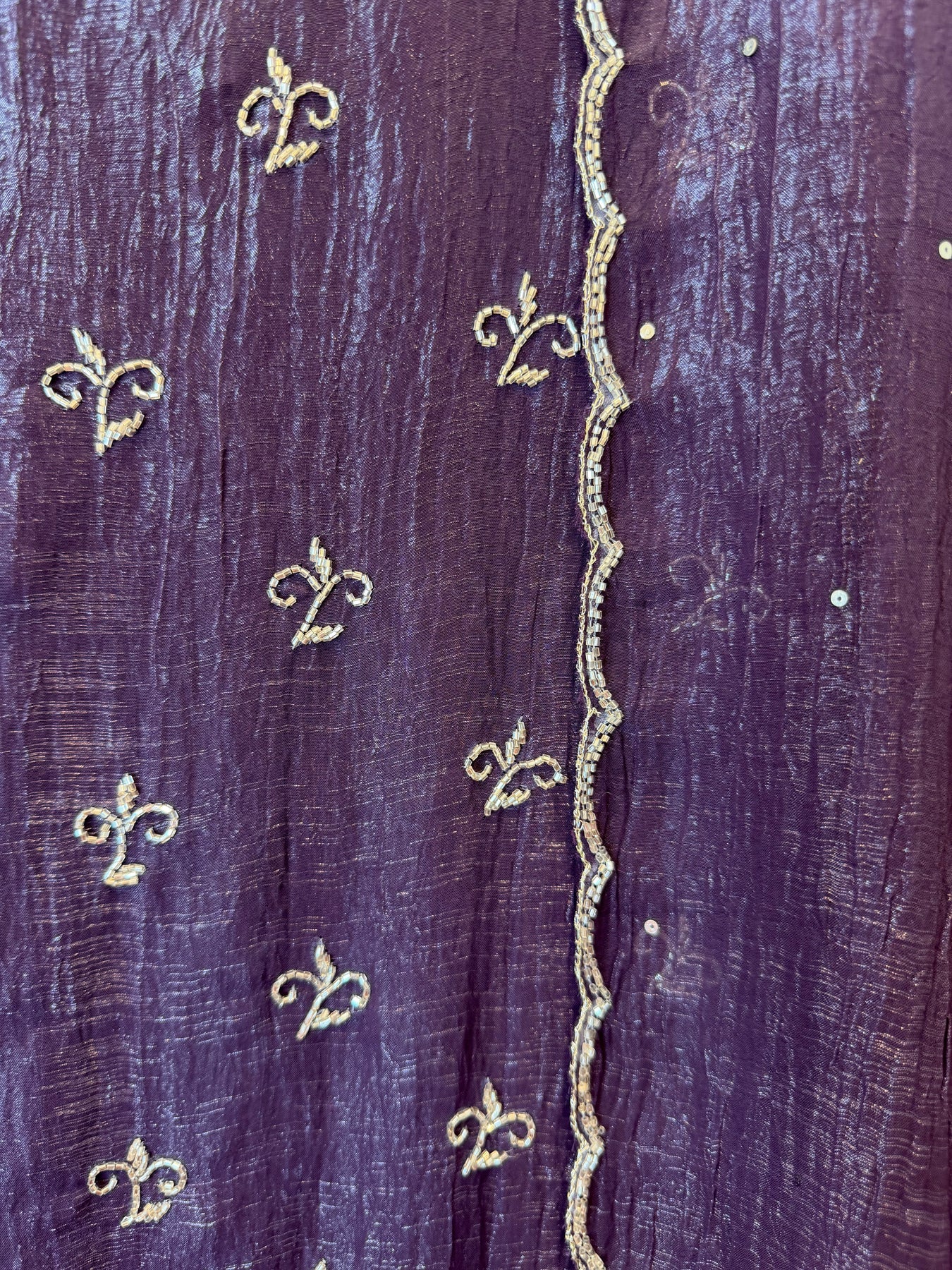 Shirt: Crushed tissue shirt with cutdana work on the front and ghera detailed with cutdana, sequin, and bead handwork
