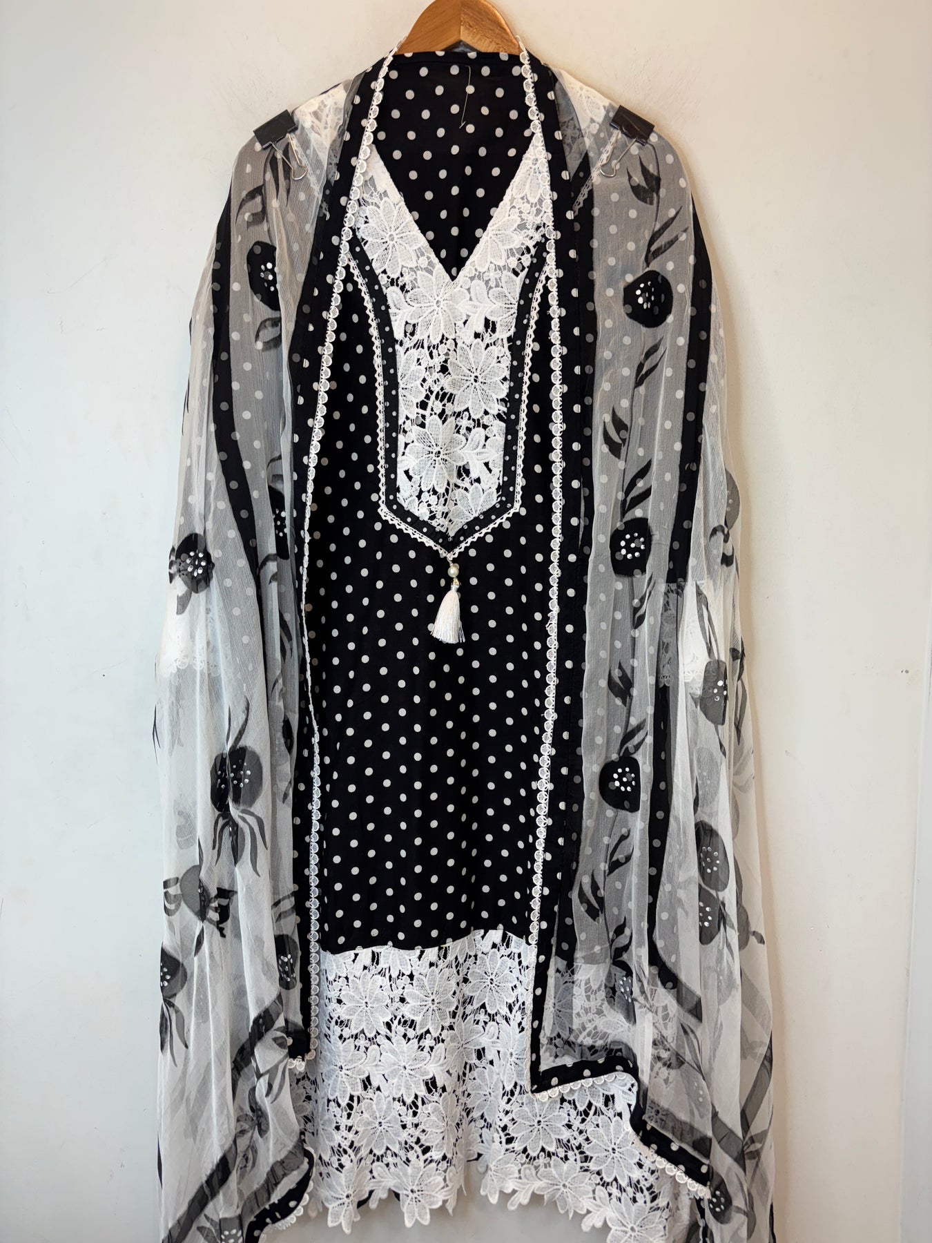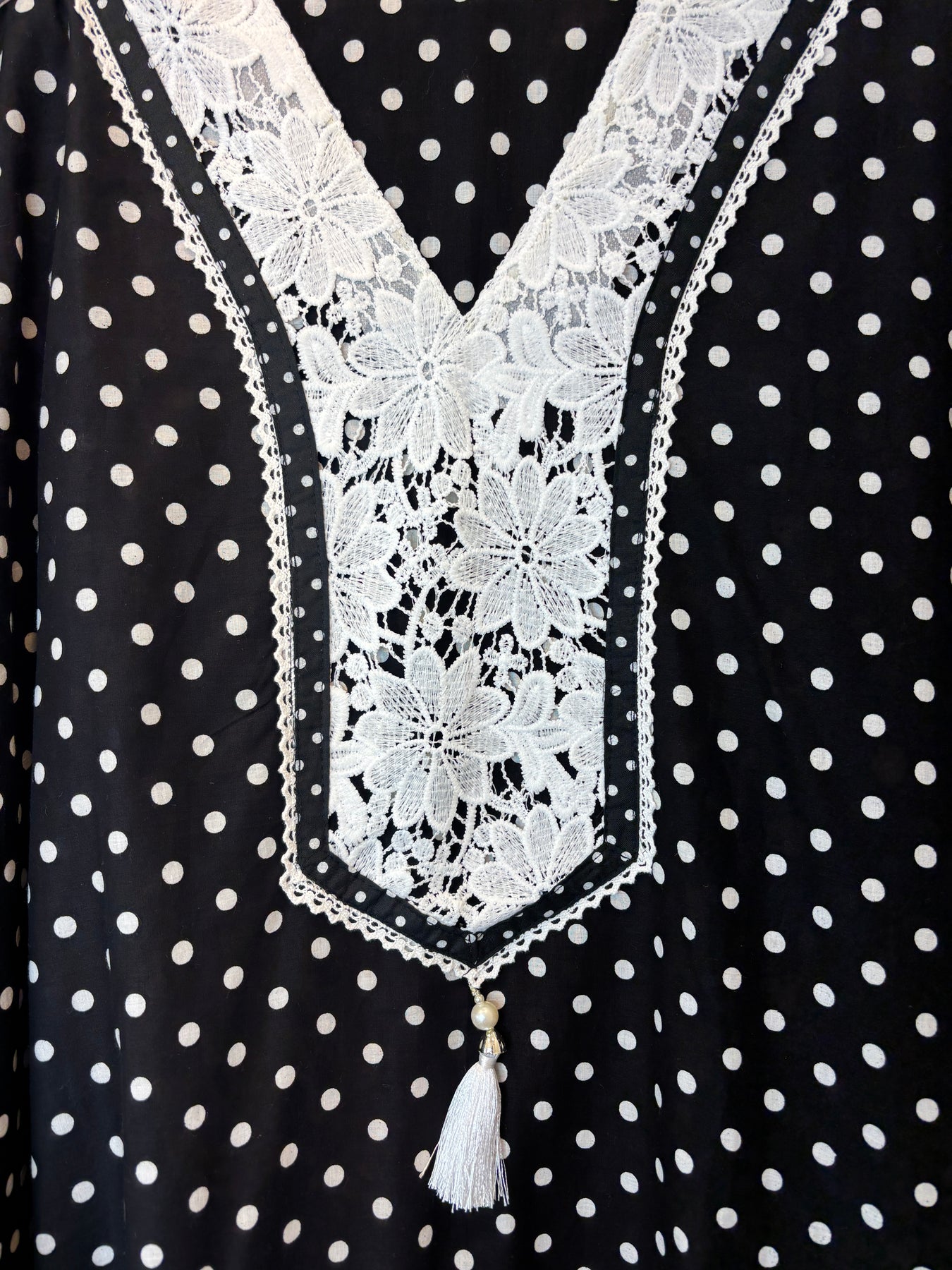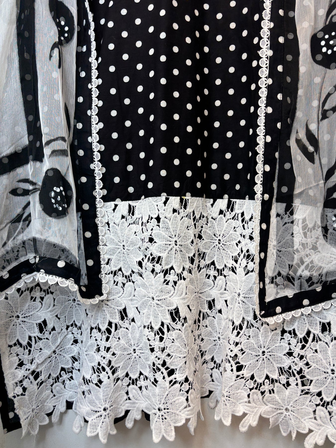Shirt: Cotton fabric with all-over polka dot print; neckline detailed with crochet work; ghera and sleeves finished with matching crochet design