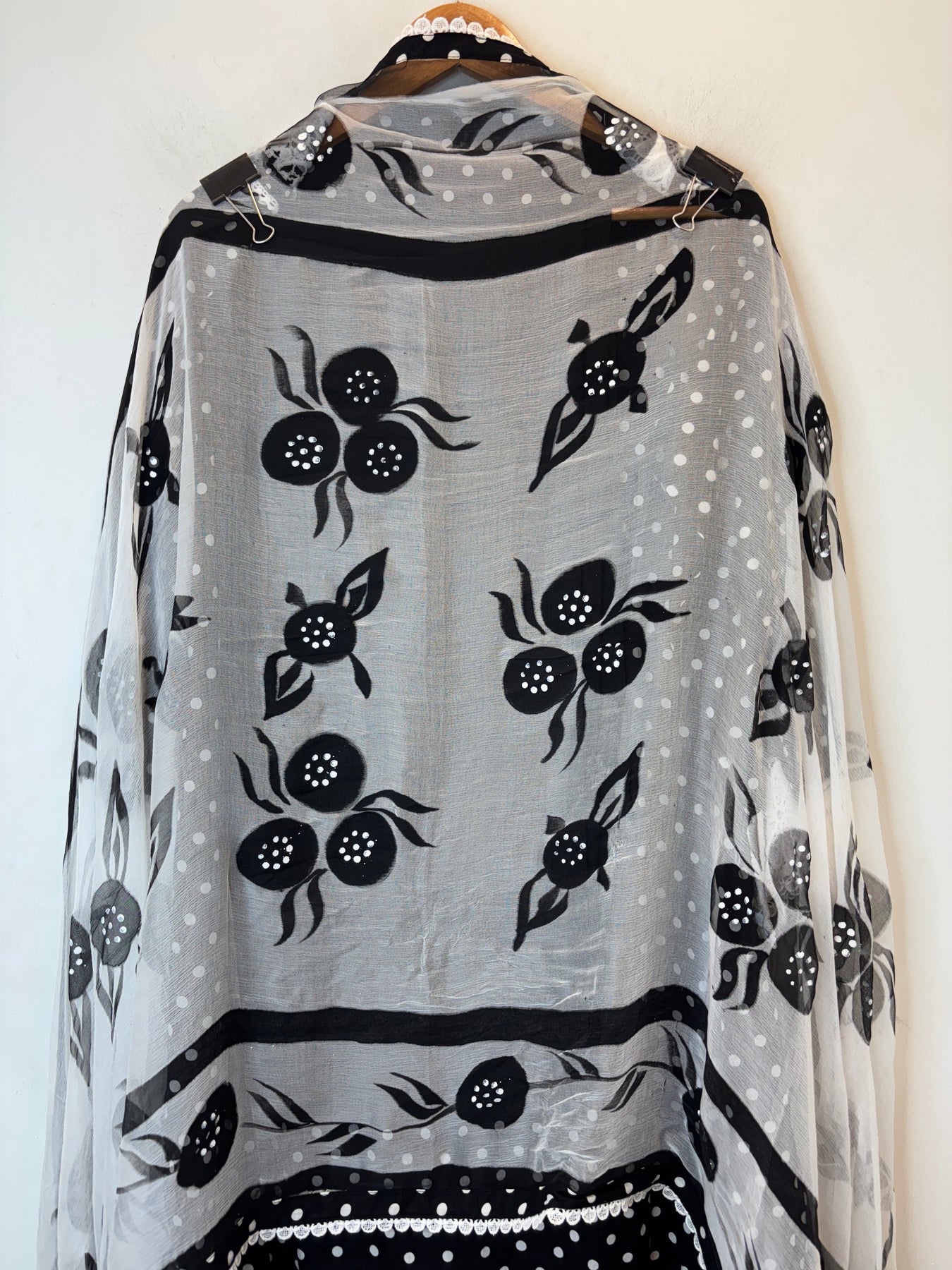 Dupatta: Chiffon dupatta featuring hand print design with lace finishing
