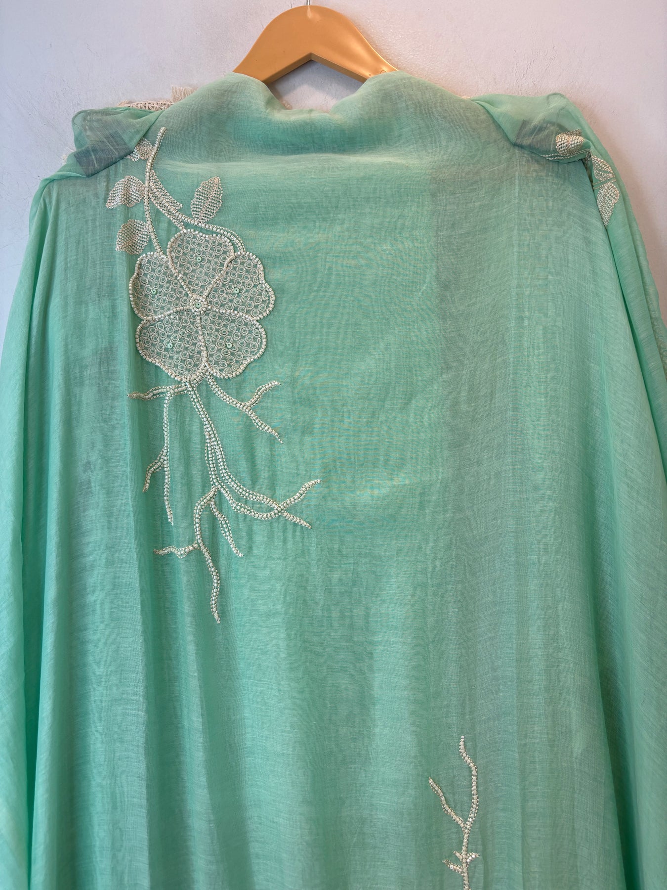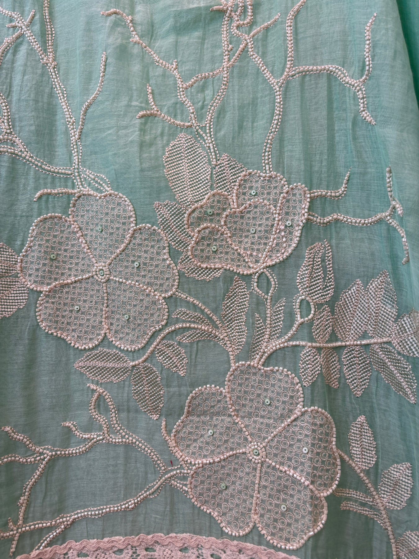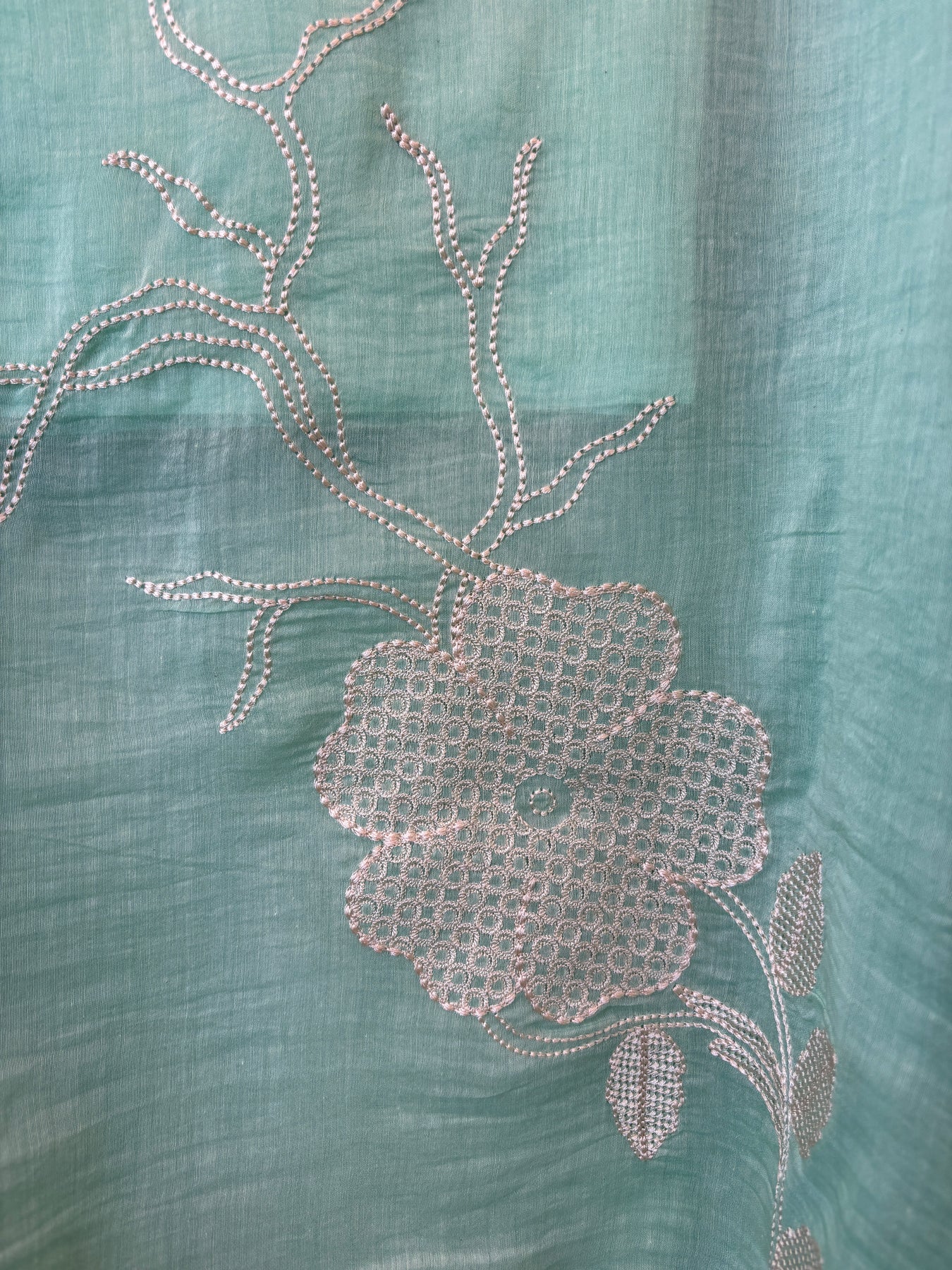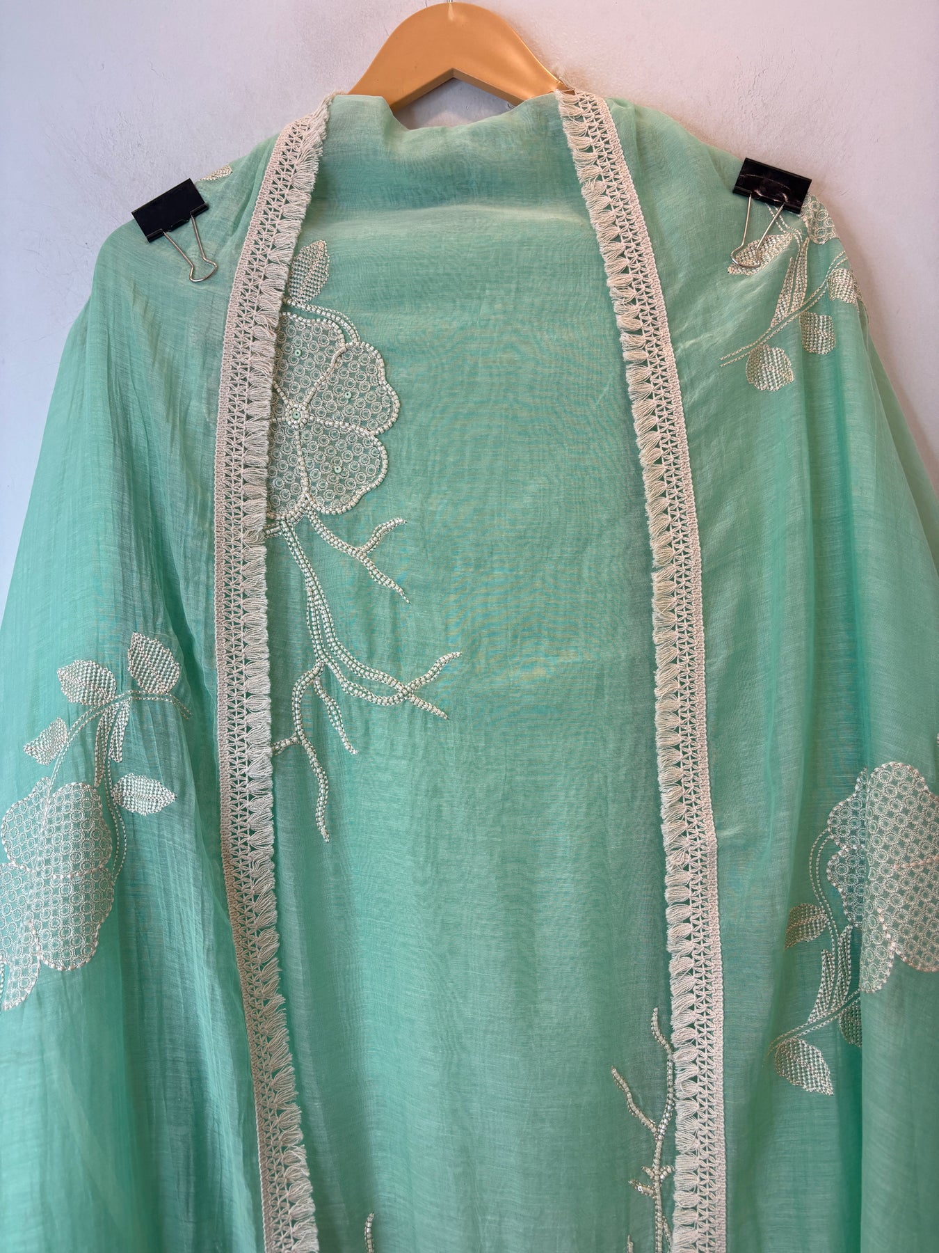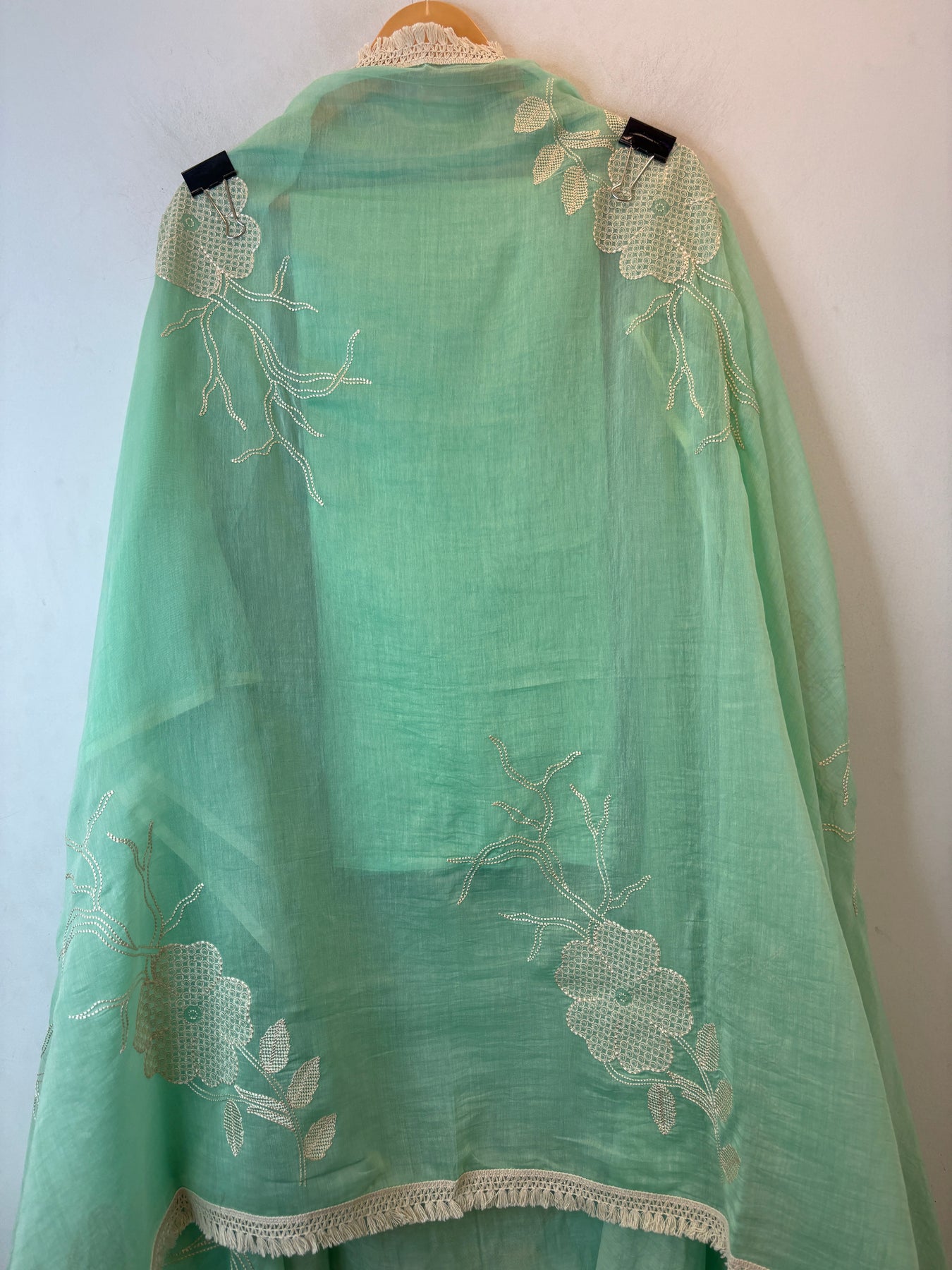 Dupatta: Mul cotton dupatta featuring floral embroidery with lace finishing on the border