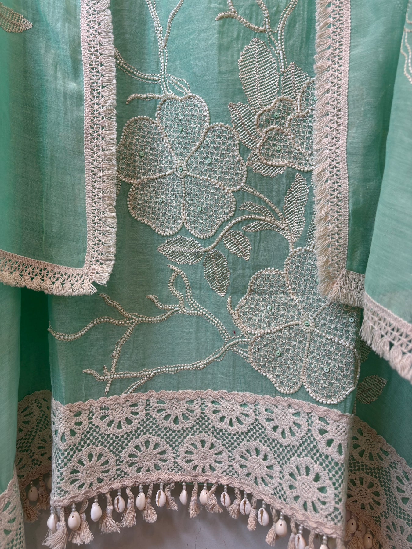 Shirt: Mul cotton fabric shirt with neckline embellished in thread embroidery with cutdana and bead highlights; ghera detailed with embroidery, cutdana, and bead work, finished with crochet detailing and tassel finishing